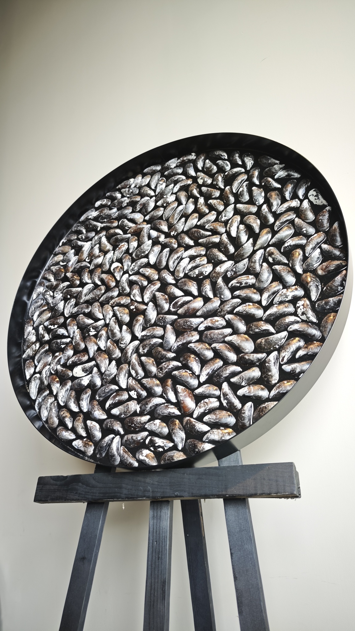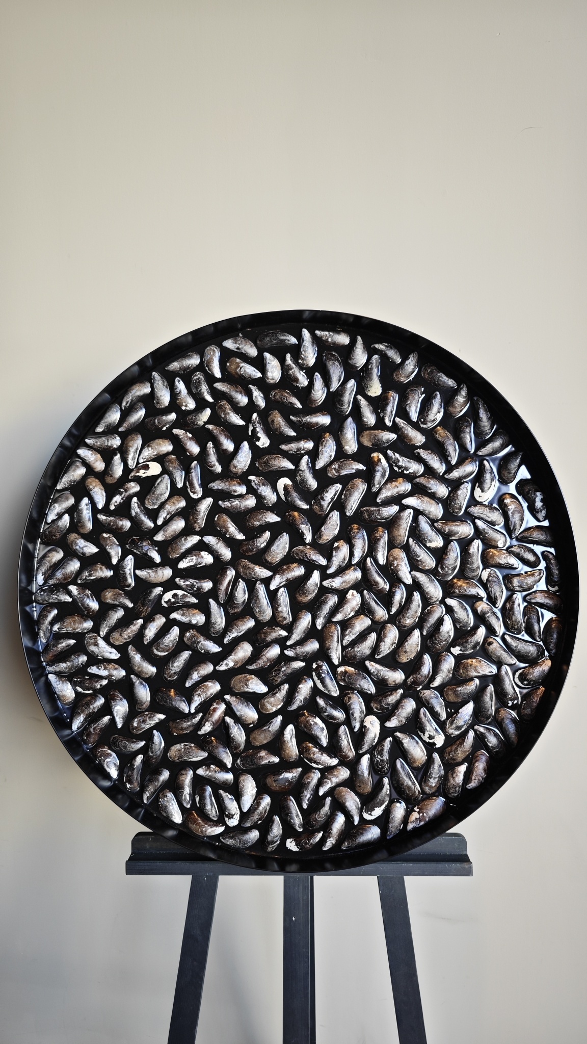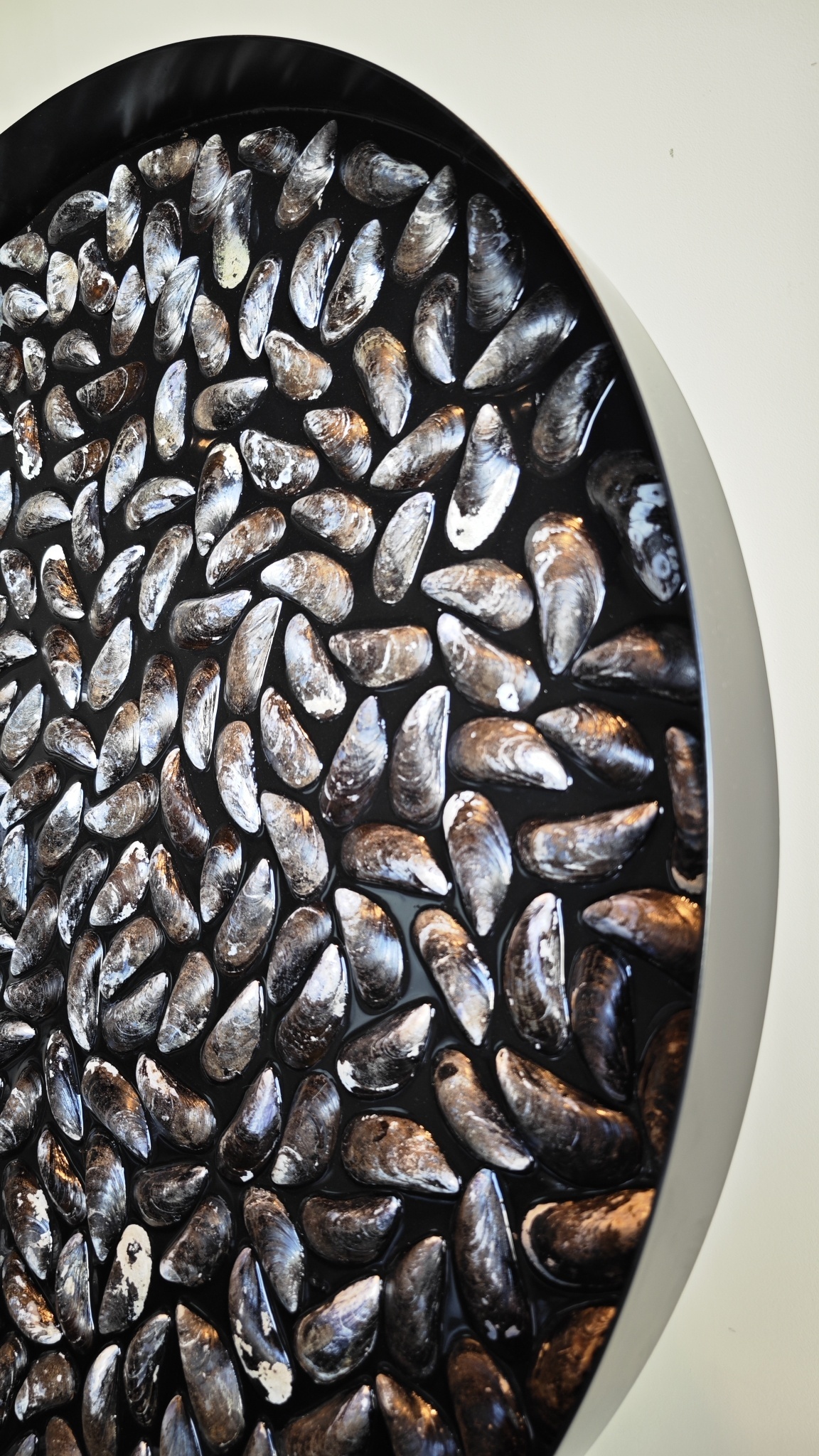 Dieser Muschelkreis mit Stahlrand ist ein wunderschönes Dekorationsstück, das die natürliche Schönheit des Meeres ins Haus bringt. Der Kreis besteht aus echten Muscheln, die in eine schwarze/dunkelgraue Epoxyschicht gegossen wurden und zusammen ein schönes Ganzes bilden. Die Muscheln werden von Hand ausgewählt, gründlich gewaschen und hygienisch verarbeitet. Der pulverbeschichtete schwarze Stahlrand in RAL 9005 verleiht dem Kunstwerk eine moderne Ausstrahlung und bildet einen schönen Kontrast zu den natürlichen Formen der Muscheln. Dieser Muschelkreis ist ein echter Blickfang für Liebhaber von Natur und Meer.