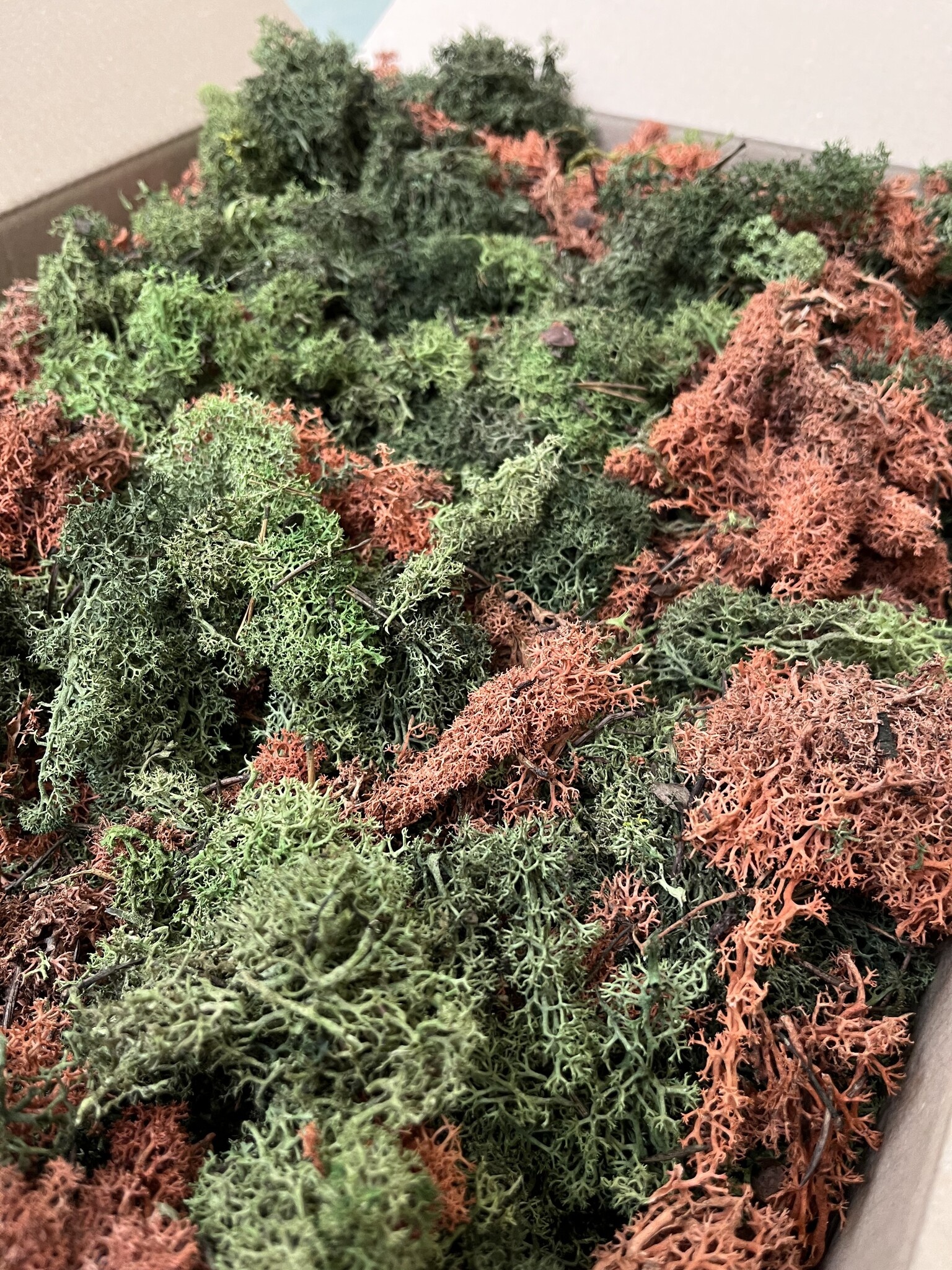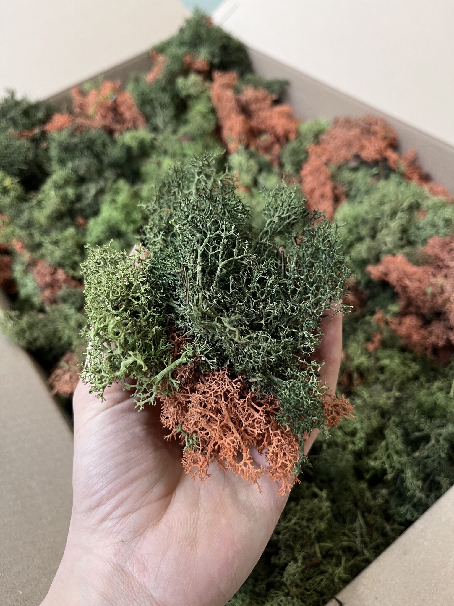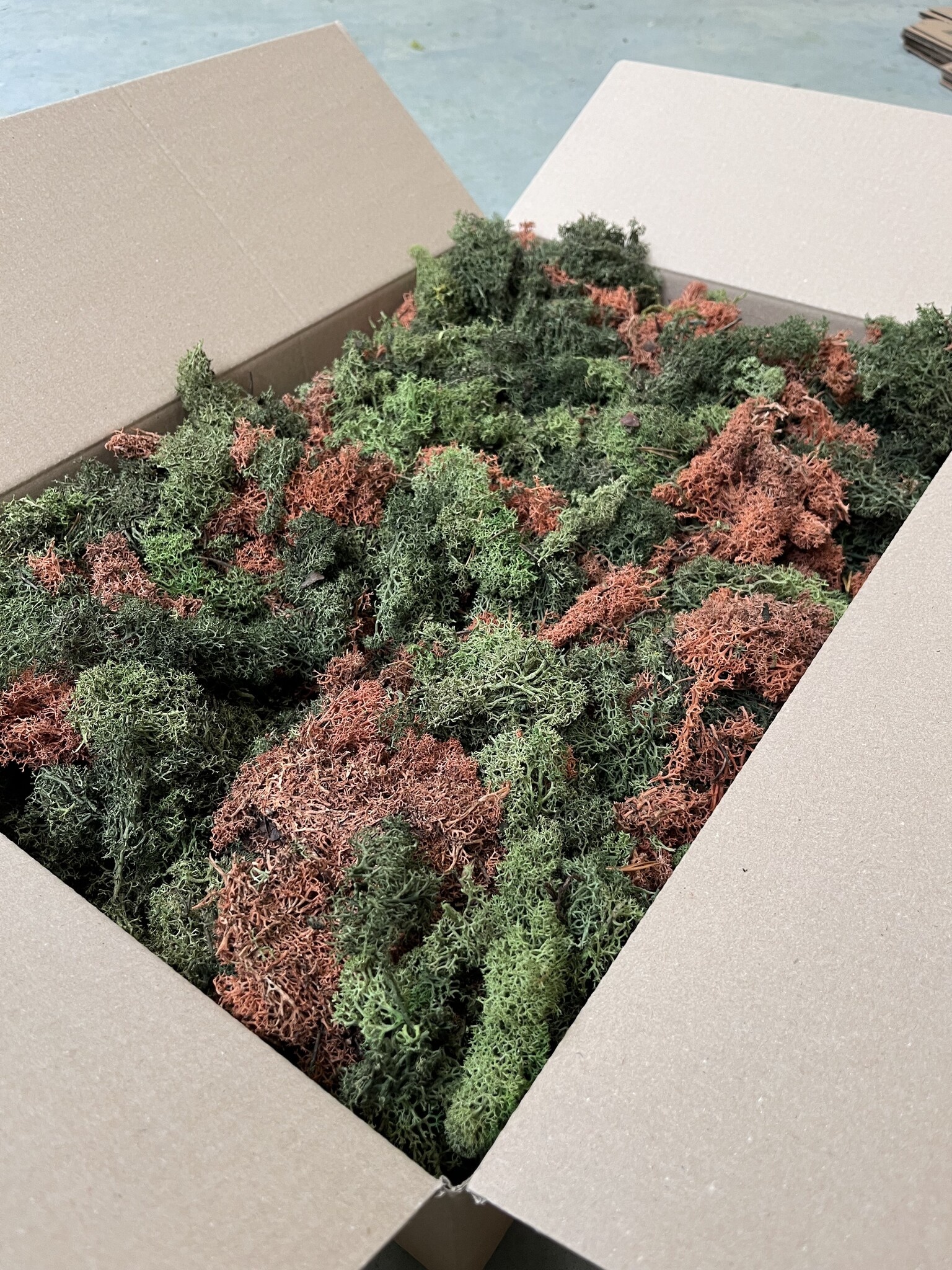 Diese L-Box von 60x40x10 cm enthält ECO-Moos. Gut für die Herstellung von 0,20-0,35 m². Das hängt davon ab, wie "fest" Sie das Moos verarbeiten wollen und wie "pingelig" Sie das gelieferte Moos auswählen und verarbeiten. Bei der Verwendung dieses vollen Mooses kehren die natürlich vorkommenden Farbnuancen zurück. Die ECO-Boxen enthalten weniger 'Moosköpfe' als die Reindeer Moss-Boxen. Wenn Sie eine schlichte Mooswand wünschen, wählen Sie die normalen Rentiermooskästen. Wenn die Wand wilder aussehen soll und Sie preisbewusst sind, eignen sich unsere ECO L-Boxen für Ihr Projekt. Sie können sich auch für einen Mix entscheiden, bei dem verschiedene Farbtöne miteinander gemischt werden, um einen spielerischen und abwechslungsreichen Effekt zu erzielen.