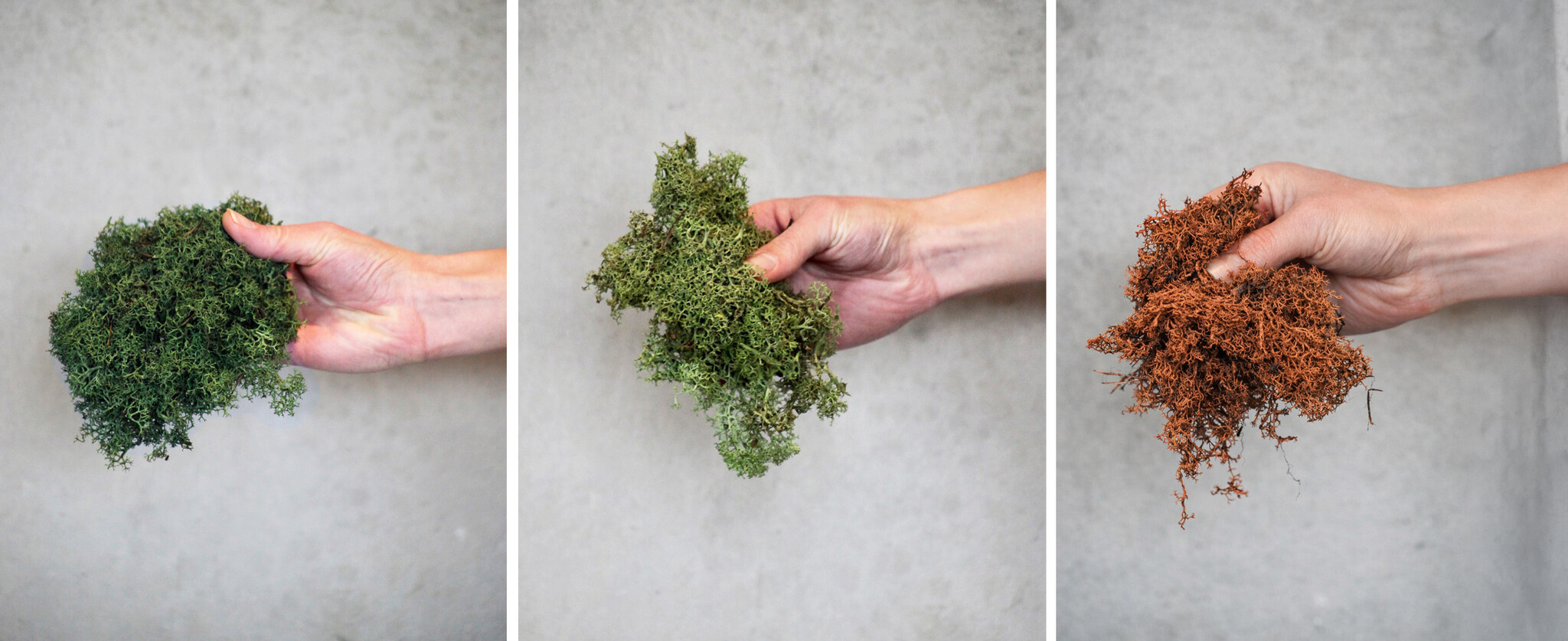 • Dauerhaft weich. Bei einer niedrigen Luftfeuchtigkeit von 20-30% kann das Moos aushärten. Sobald die Luftfeuchtigkeit wieder ansteigt, wird das Moos wieder weich.