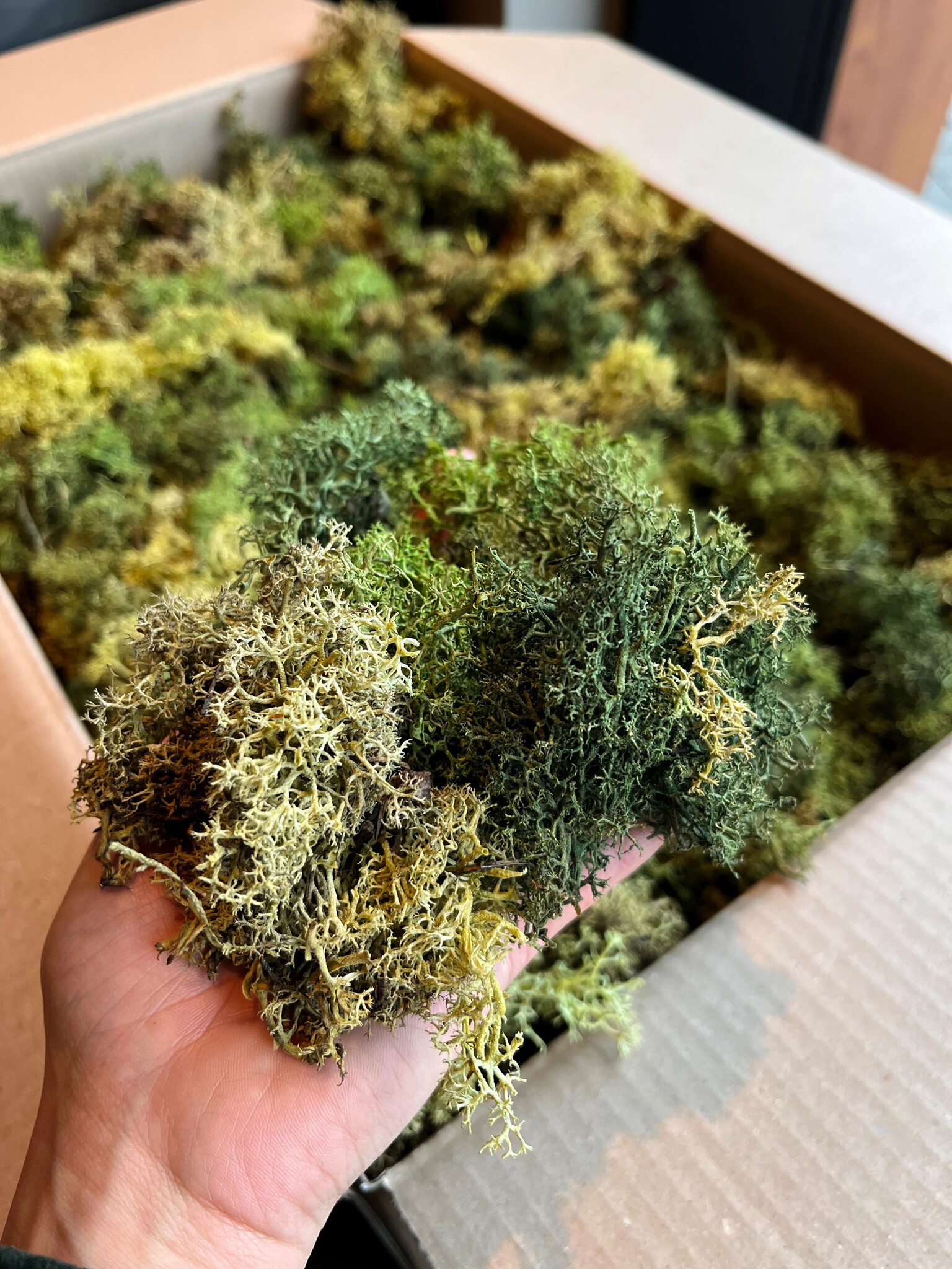 Die [XXL]-Boxen von ECO Rentiermoos enthalten echte Natur! Der gesamte Kern des Mooses ist in der Box hinzugefügt. Nach der Verarbeitung erhält das Produkt ein robustes und wildes Aussehen. Die Verwendung dieses kompletten Mooses bringt natürlich vorkommende Farbnuancen zurück. Die ECO-Boxen enthalten weniger "Moosköpfe" als die Rentiermoos-Boxen. Wenn Sie eine saubere Mooswand wünschen, wählen Sie die normalen Rentiermooskästen. Soll die Wand einen wilderen Look haben und sind Sie preisbewusst, dann sind unsere ECO XXL-Boxen für Ihr Projekt geeignet. Sie können auch einen Mix wählen, bei dem verschiedene Farbtöne miteinander gemischt werden, um einen spielerischen und abwechslungsreichen Effekt zu erzielen.