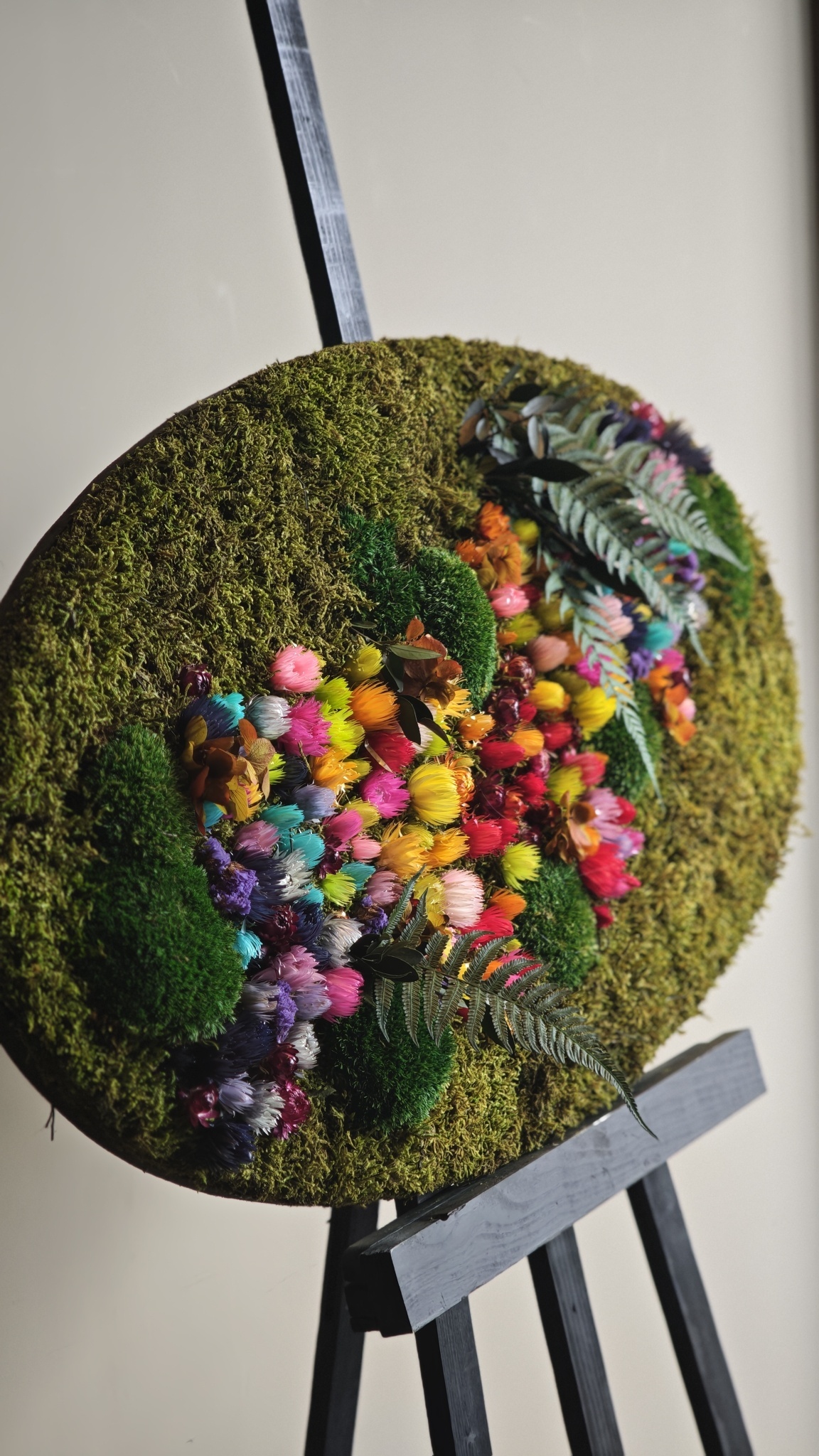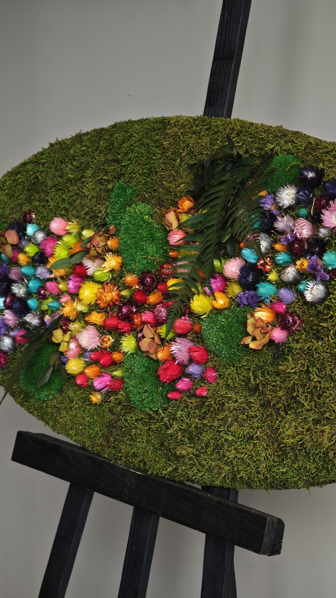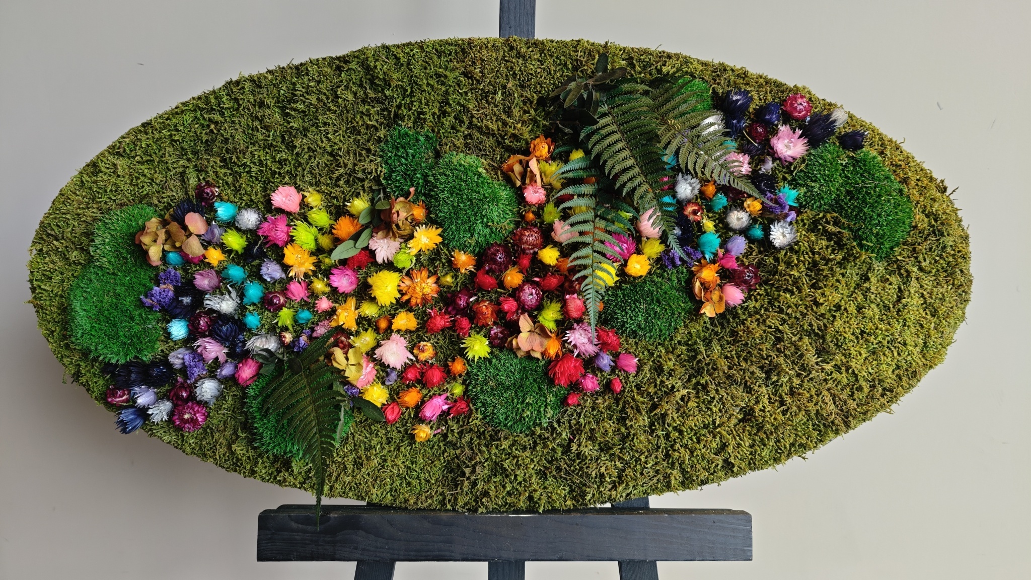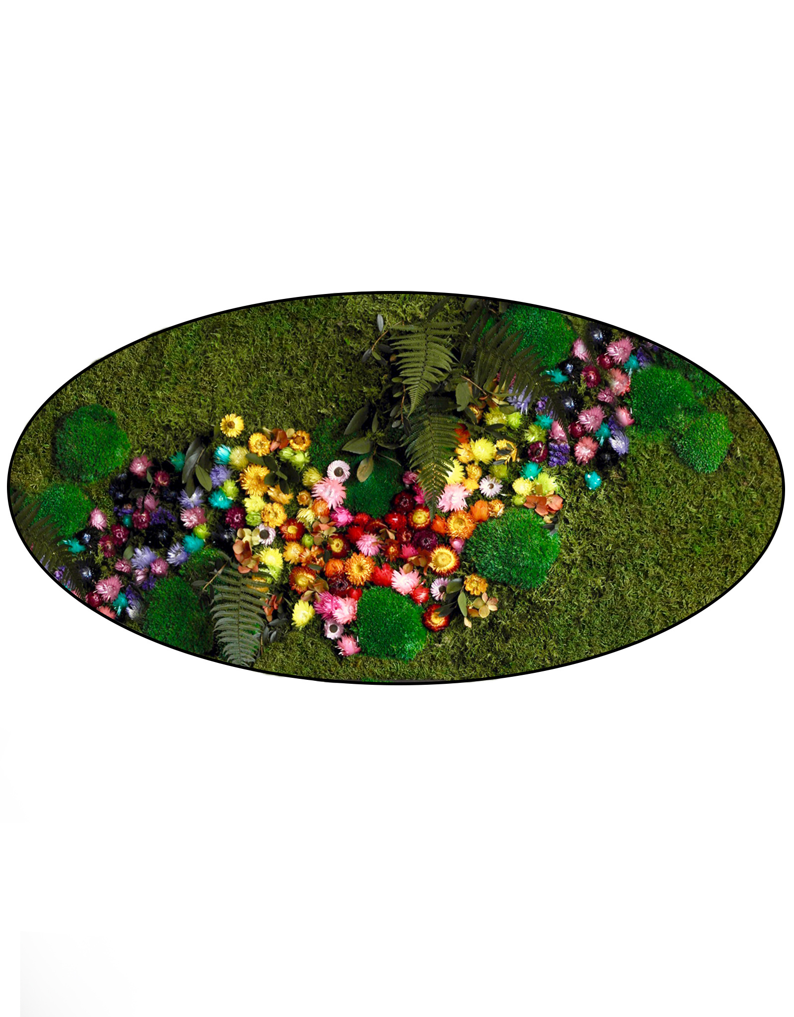 Ovales Moosbild Liva im Blumen Stil ist ein Moosbild, das aus einem Sockel aus Flachmoos und Kugelmoos besteht, der durch Dschungelblätter ergänzt wird. Darüber hinaus enthält dieses Moosbild eine anmutige Reihe getrockneter Blumen in leuchtenden Regenbogenfarben, die dem Ganzen ein verspieltes und anmutiges Aussehen verleihen. Dieses Moosbild verbindet die natürliche Ruhe des Mooses mit der farbenfrohen Fröhlichkeit der Blumen und ist zudem völlig pflegefrei.