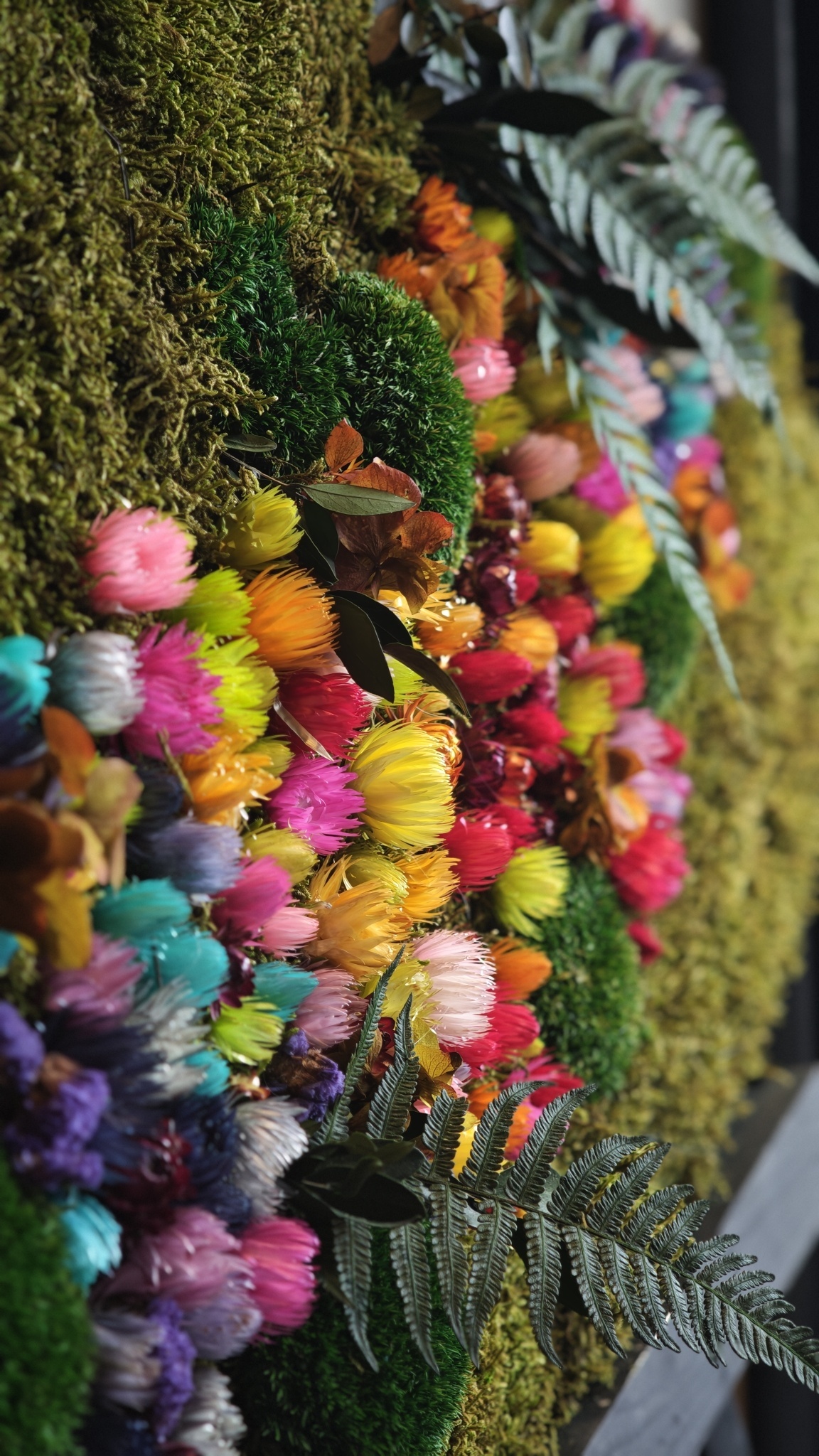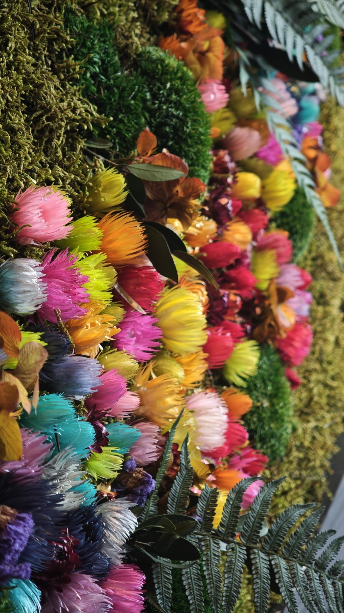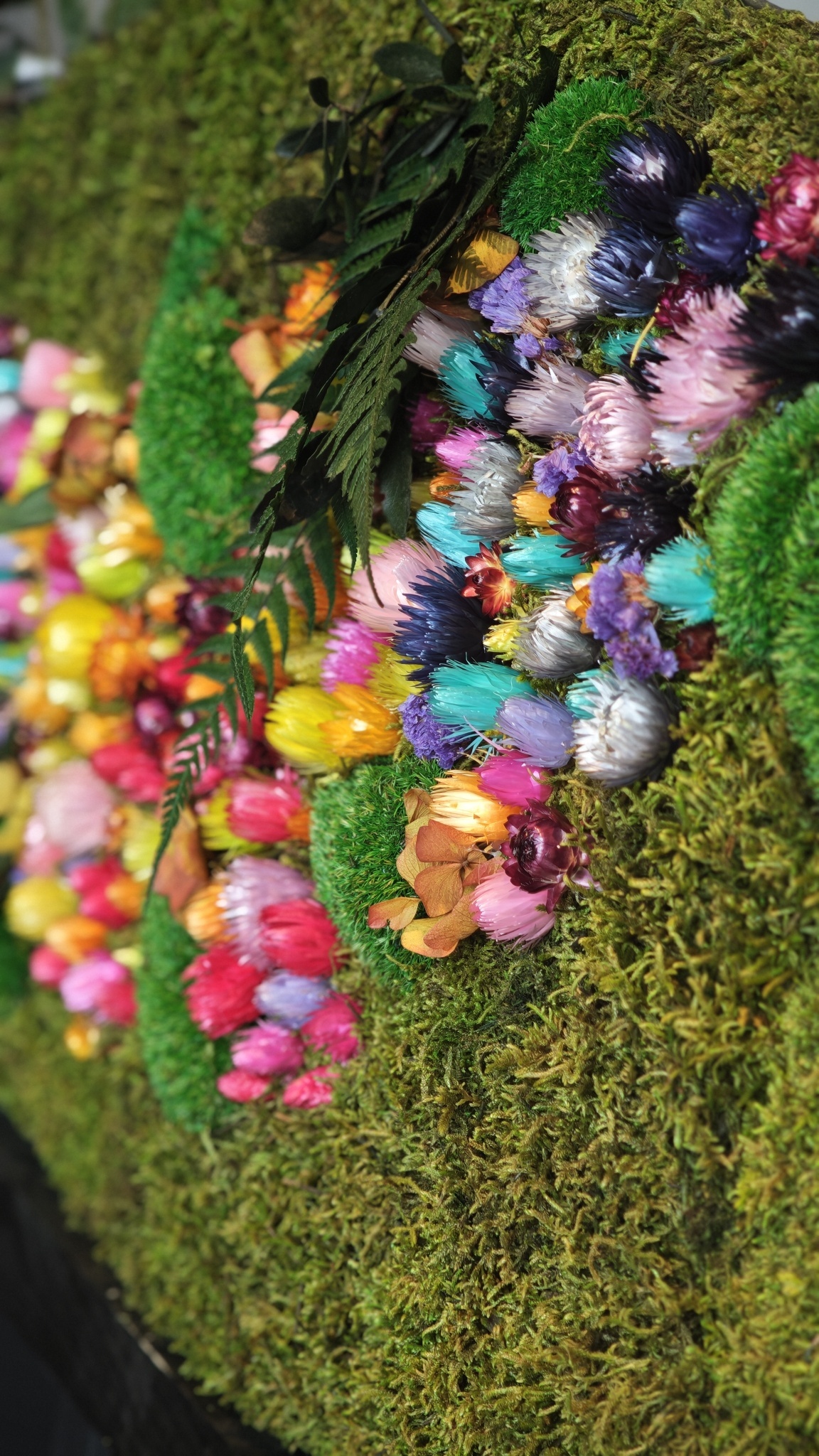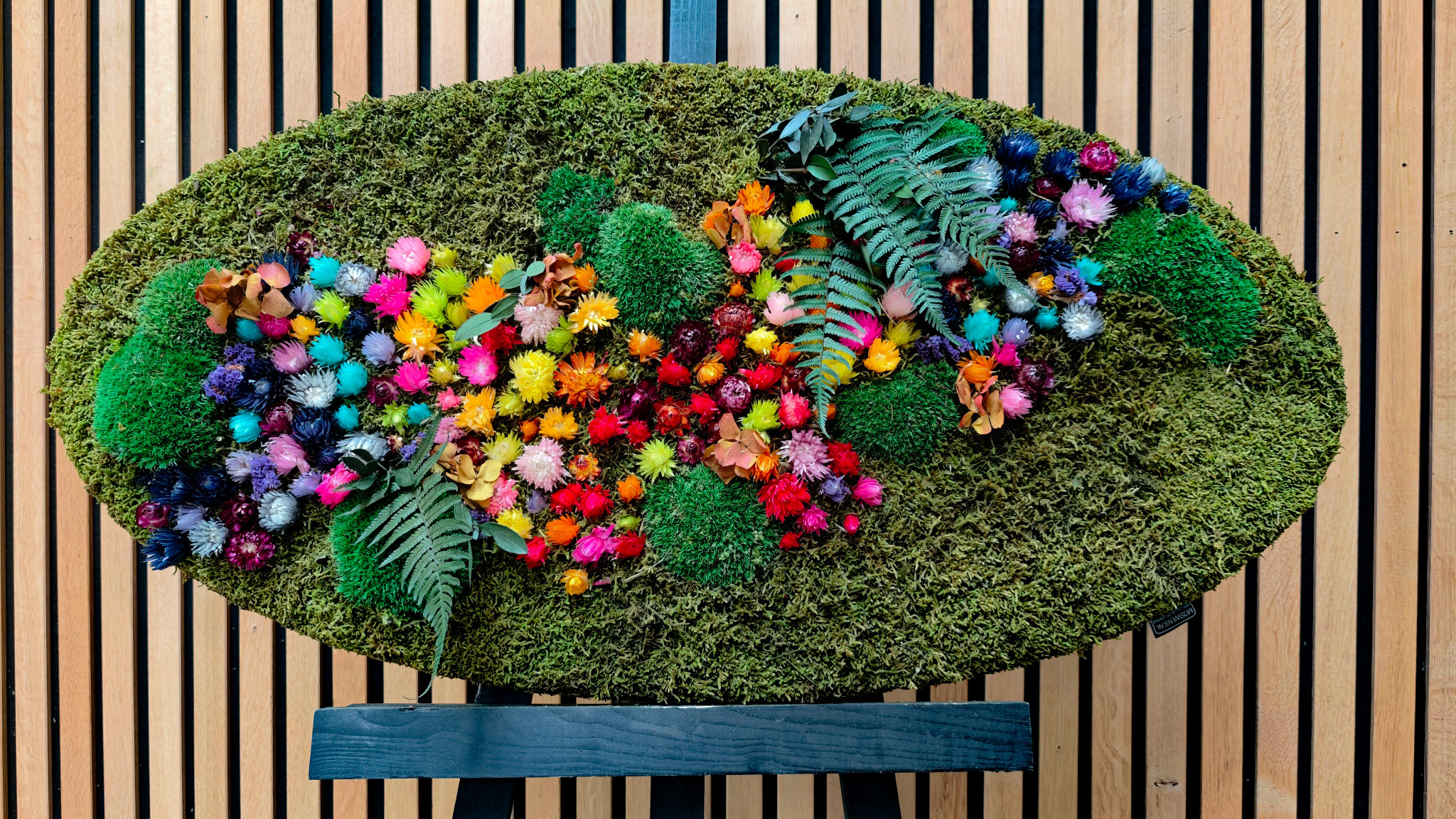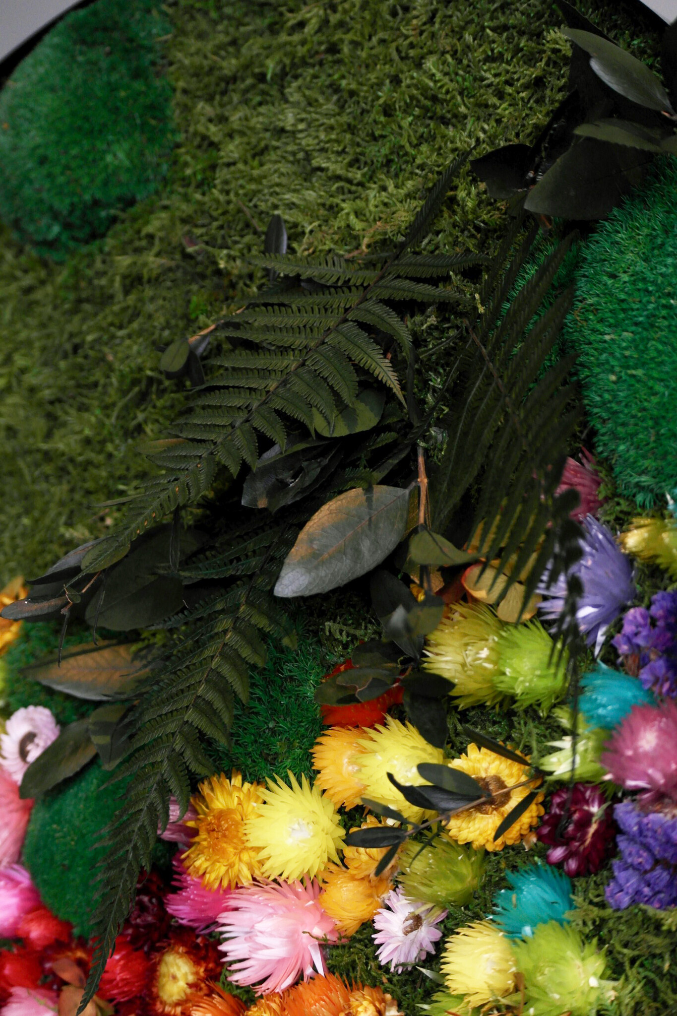 Ovales Moosbild Liva im Blumen Stil ist ein Moosbild, das aus einem Sockel aus Flachmoos und Kugelmoos besteht, der durch Dschungelblätter ergänzt wird. Darüber hinaus enthält dieses Moosbild eine anmutige Reihe getrockneter Blumen in leuchtenden Regenbogenfarben, die dem Ganzen ein verspieltes und anmutiges Aussehen verleihen. Dieses Moosbild verbindet die natürliche Ruhe des Mooses mit der farbenfrohen Fröhlichkeit der Blumen und ist zudem völlig pflegefrei.