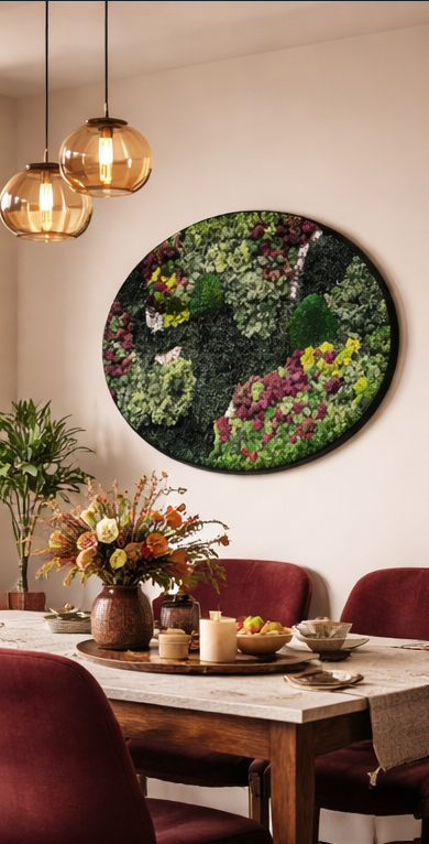 Ein lebendiger Moosbild mit verschiedenen Strukturen und Grüntönen, kombiniert mit verspielten Akzenten aus bordeauxfarbenem und Rentiermoos in der Farbe Apricis. Dunkles Flachmoos sorgt für natürliche Tiefe, während helleres Rentiermoos und kleine Stücke Baumrinde das Gesamtbild wie eine Miniatur-Waldlandschaft wirken lassen.