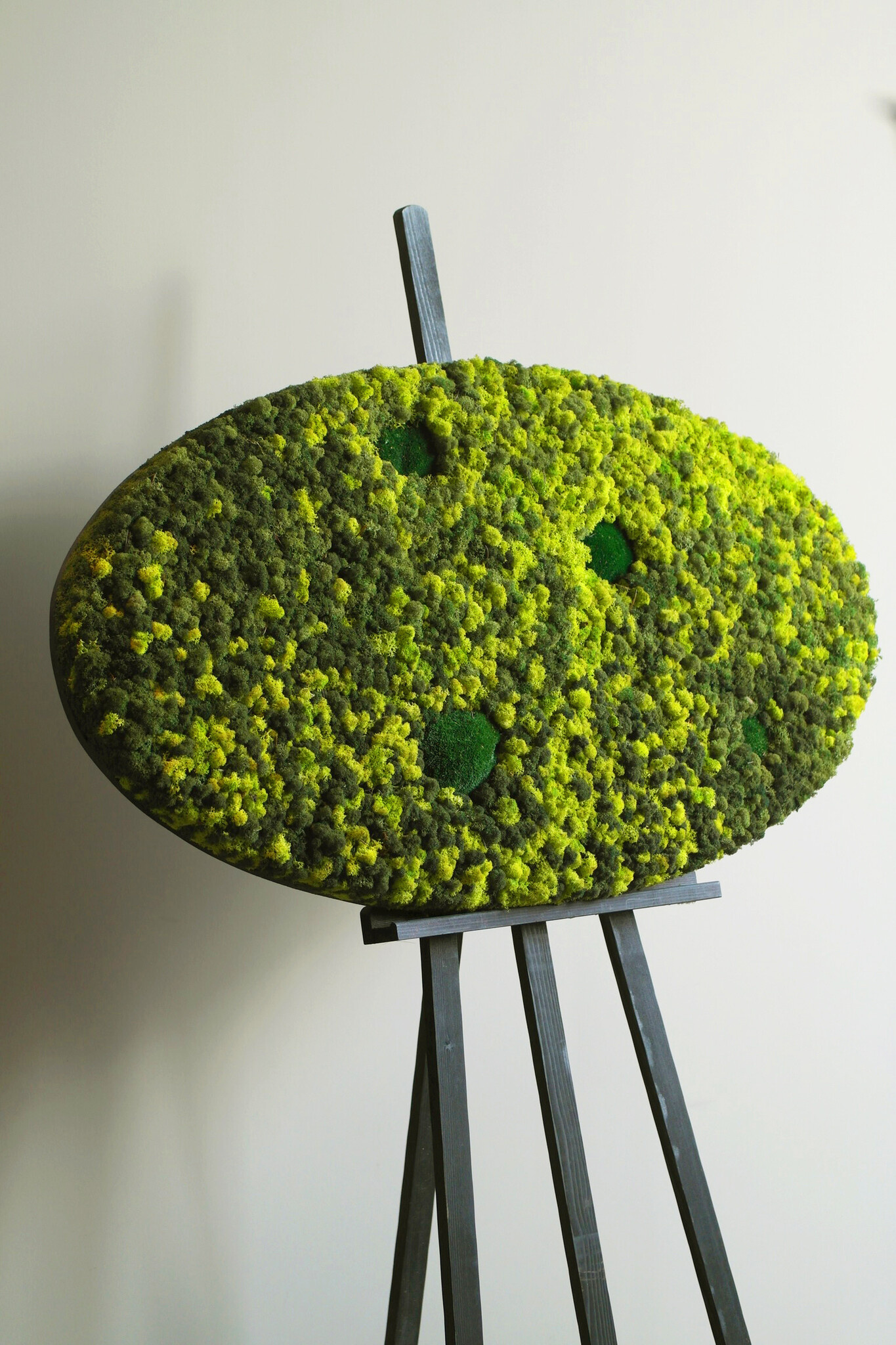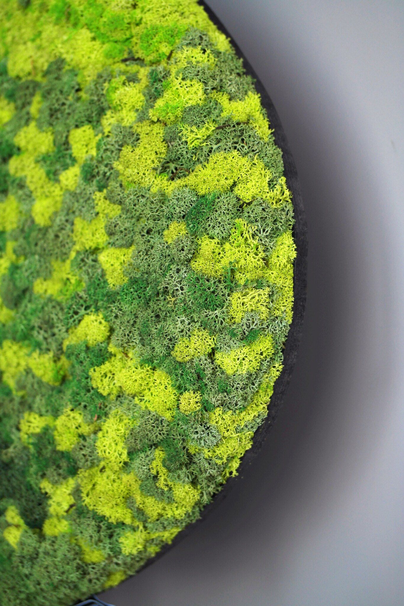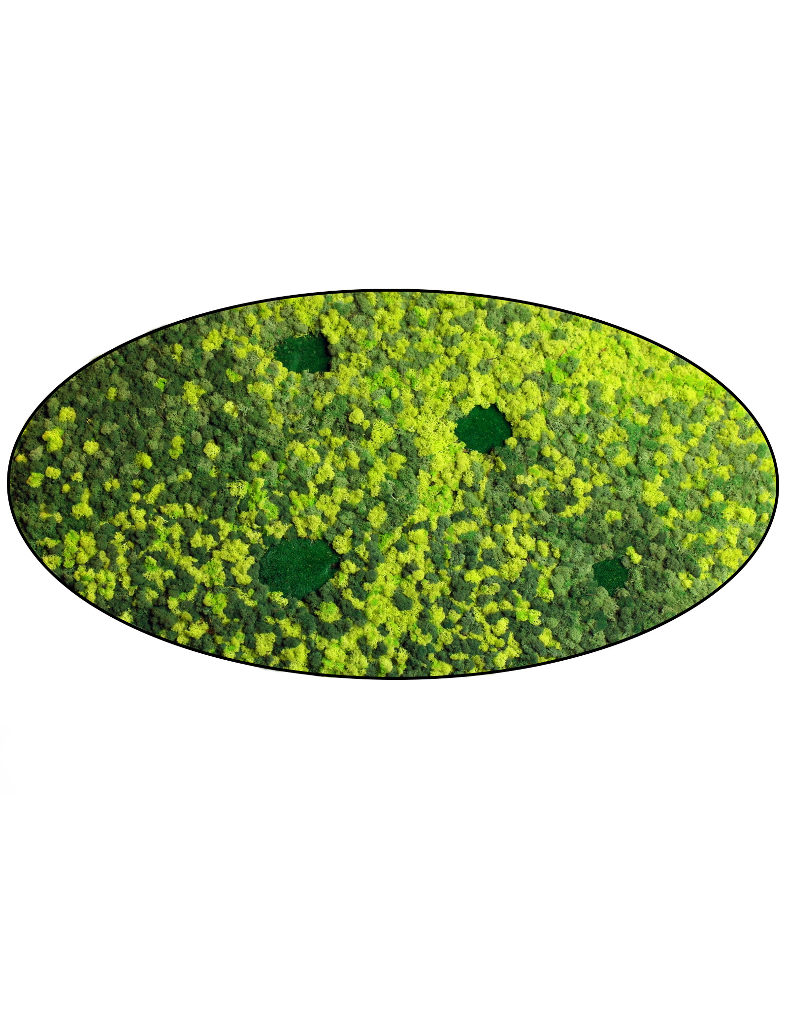 Ovales Moosbild Varius besteht aus einem auffälligen Mix aus leuchtenden Farben. Bei diesem Moosstil werden Rentiermoos und Kugelmoos verwendet. Bei diesem Moosstil gibt es weniger Höhenunterschiede, da im Moosbild kein Flachmoos verwendet wird. Dieser Moosmix macht sich gut in dunklen Räumen, da er einen frischen und energiegeladenen Look erzeugt.