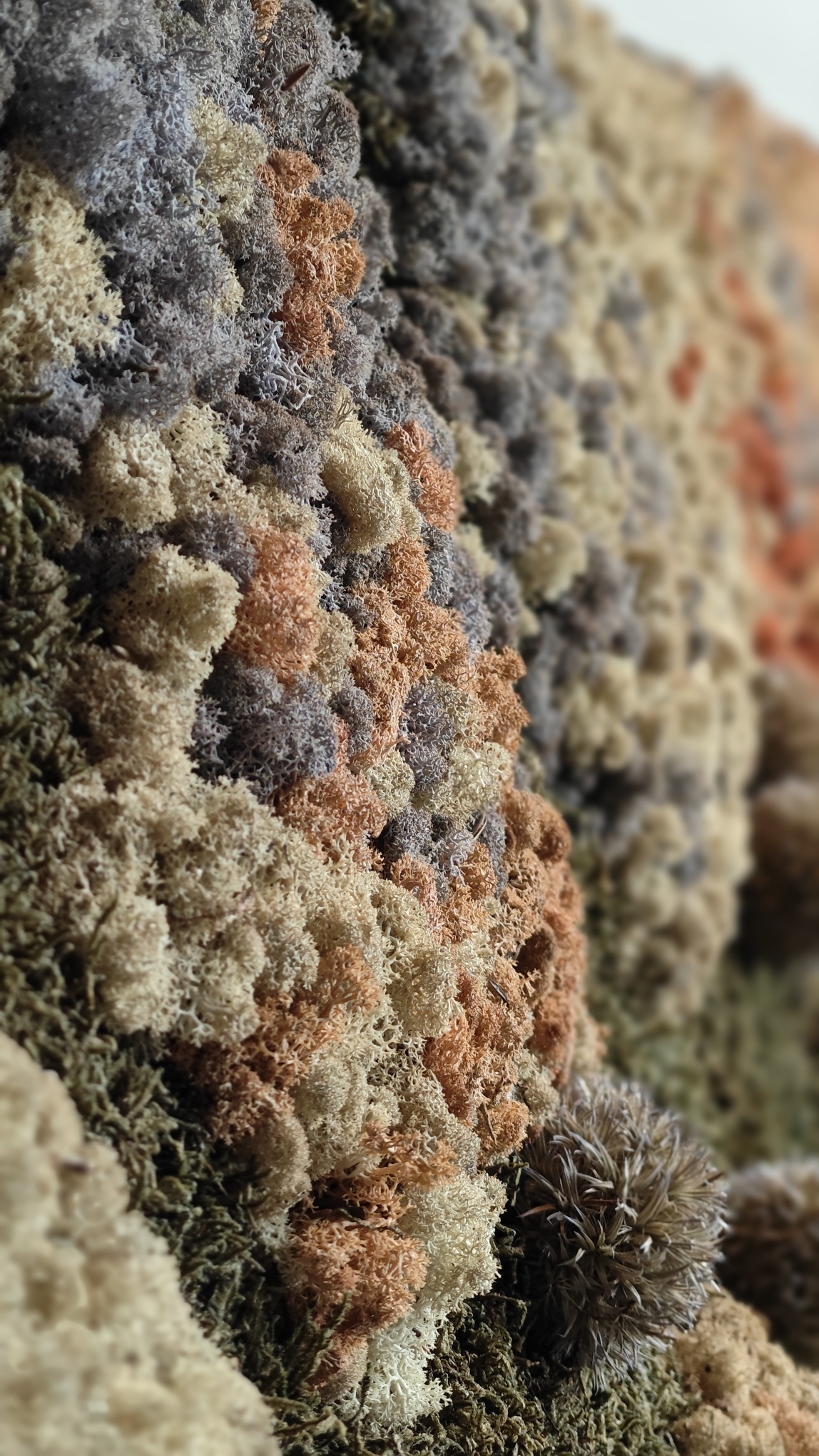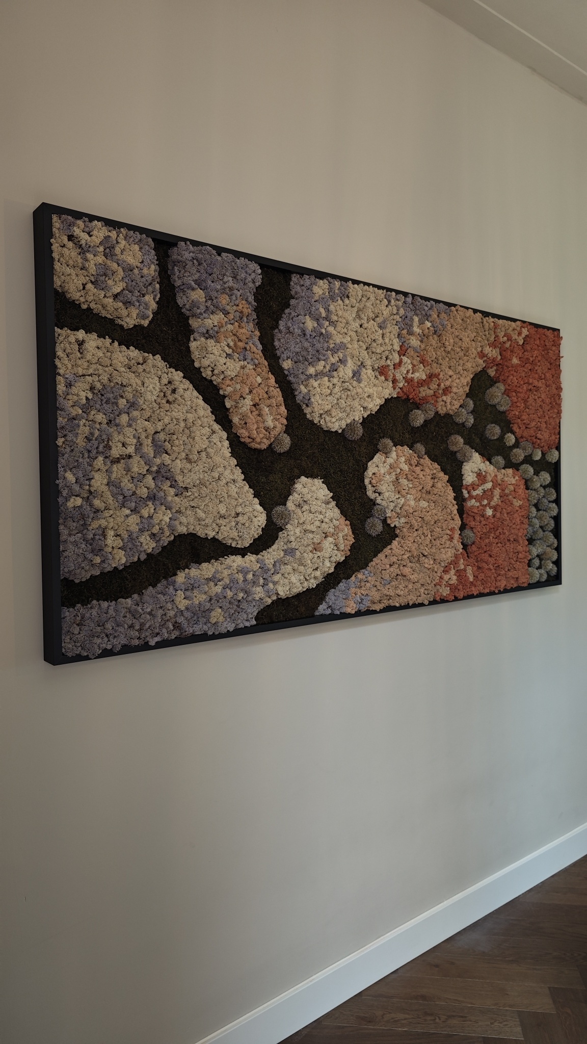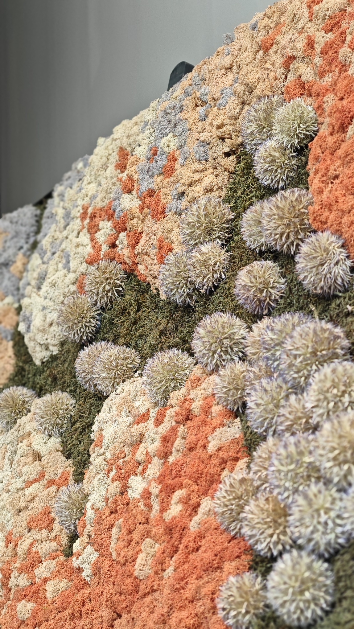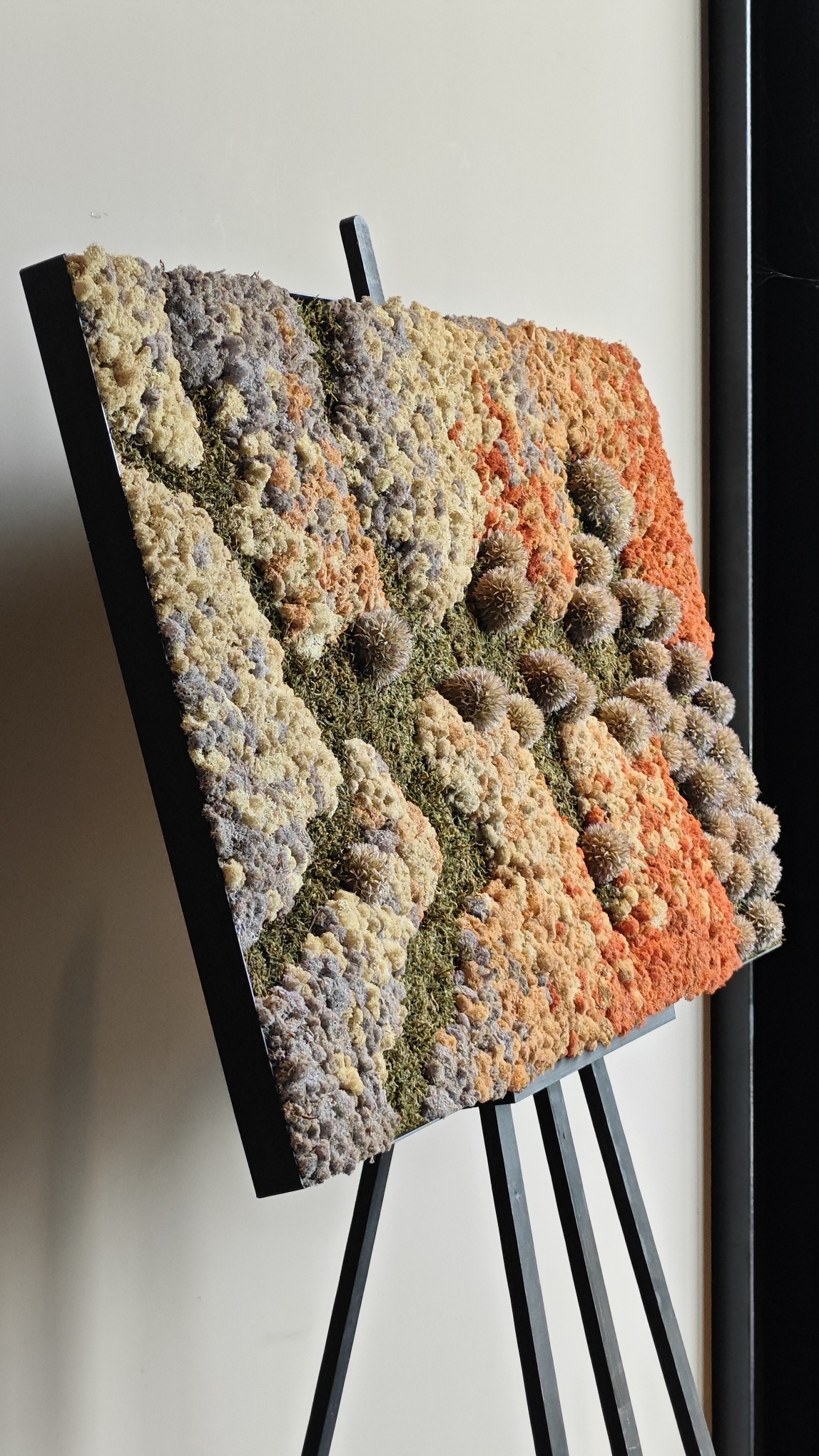 Das Moosbild Lavi ist ein farbenfrohes Kunstwerk mit hellen, fröhlichen und erdigen Tönen für eine verspielte Ausstrahlung. Der tiefgrüne Farbton des Flachmooses in der Farbe Pine bildet eine natürliche Basis, während das weiche Rentiermoos in den lebendigen Farben Danae, Persici, Naturalis und Glaciem für ein spielerisches und blühendes Farbenspiel sorgt. Die subtilen Distelakzente verleihen zusätzliche Tiefe und Struktur, wodurch ein natürliches Gesamtbild mit vielen Höhenunterschieden entsteht. Dieses einzigartige Bild bringt Wärme und Atmosphäre in jeden Raum!