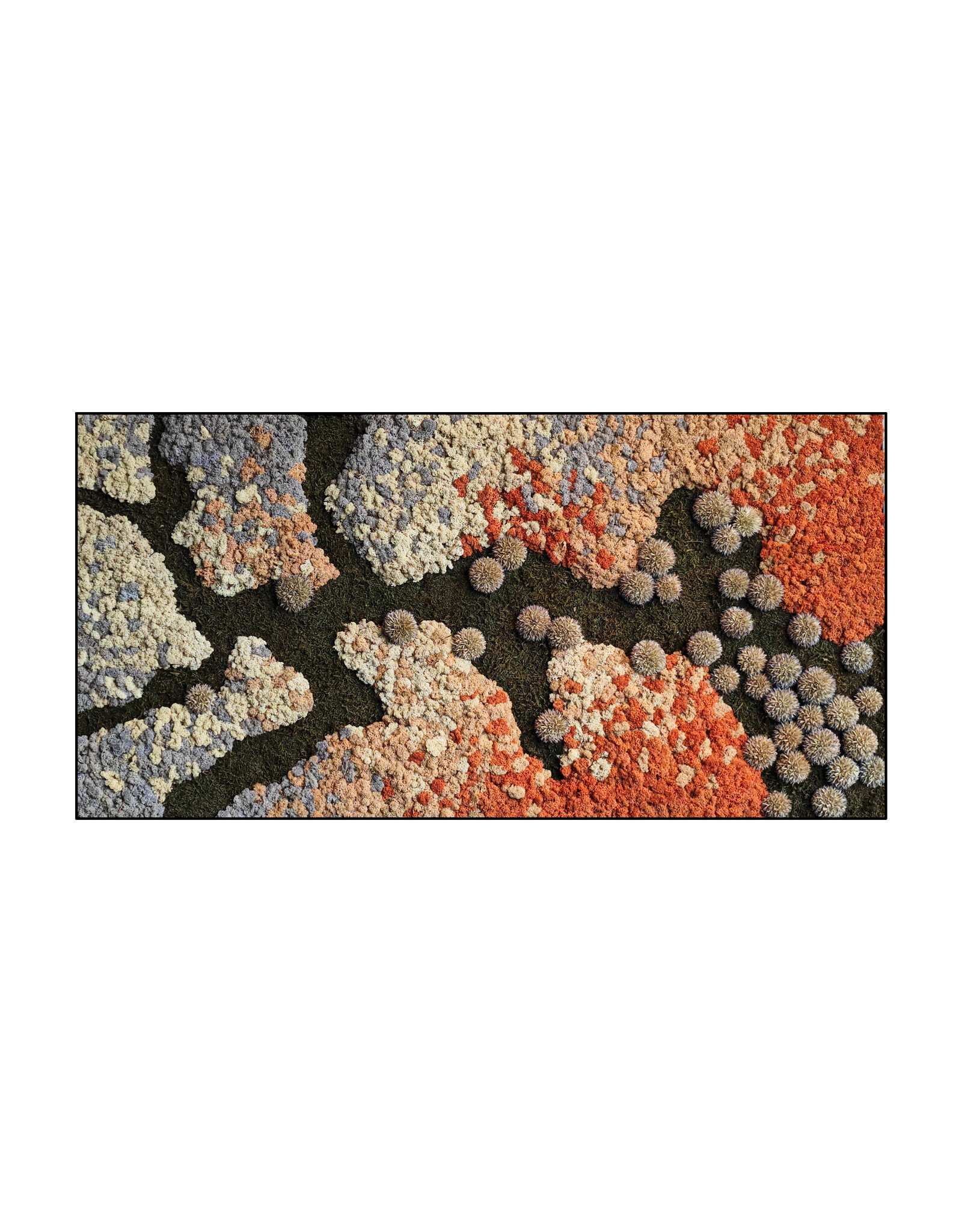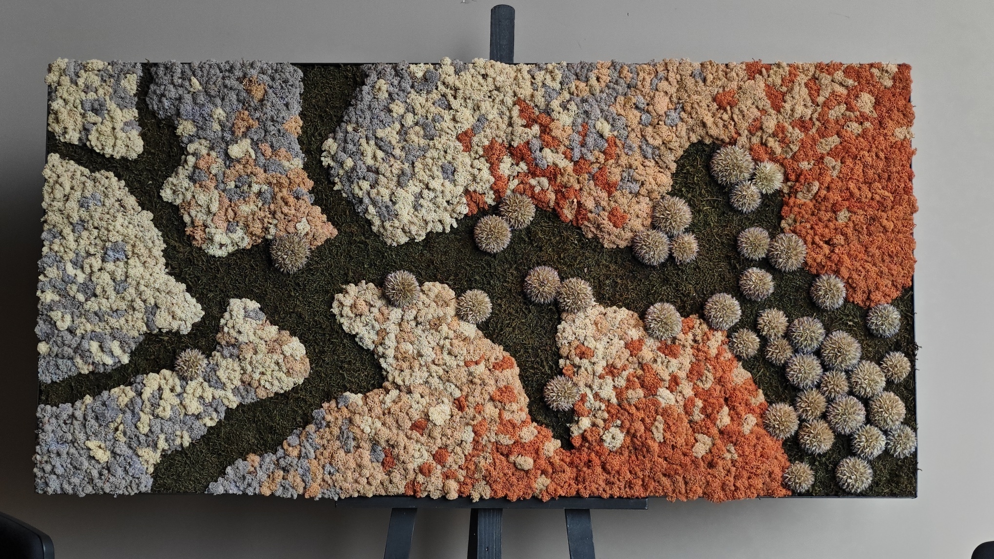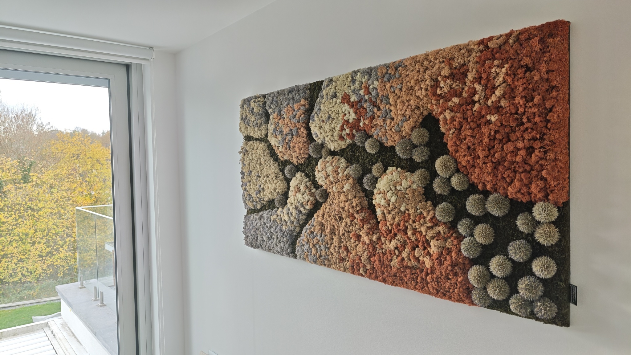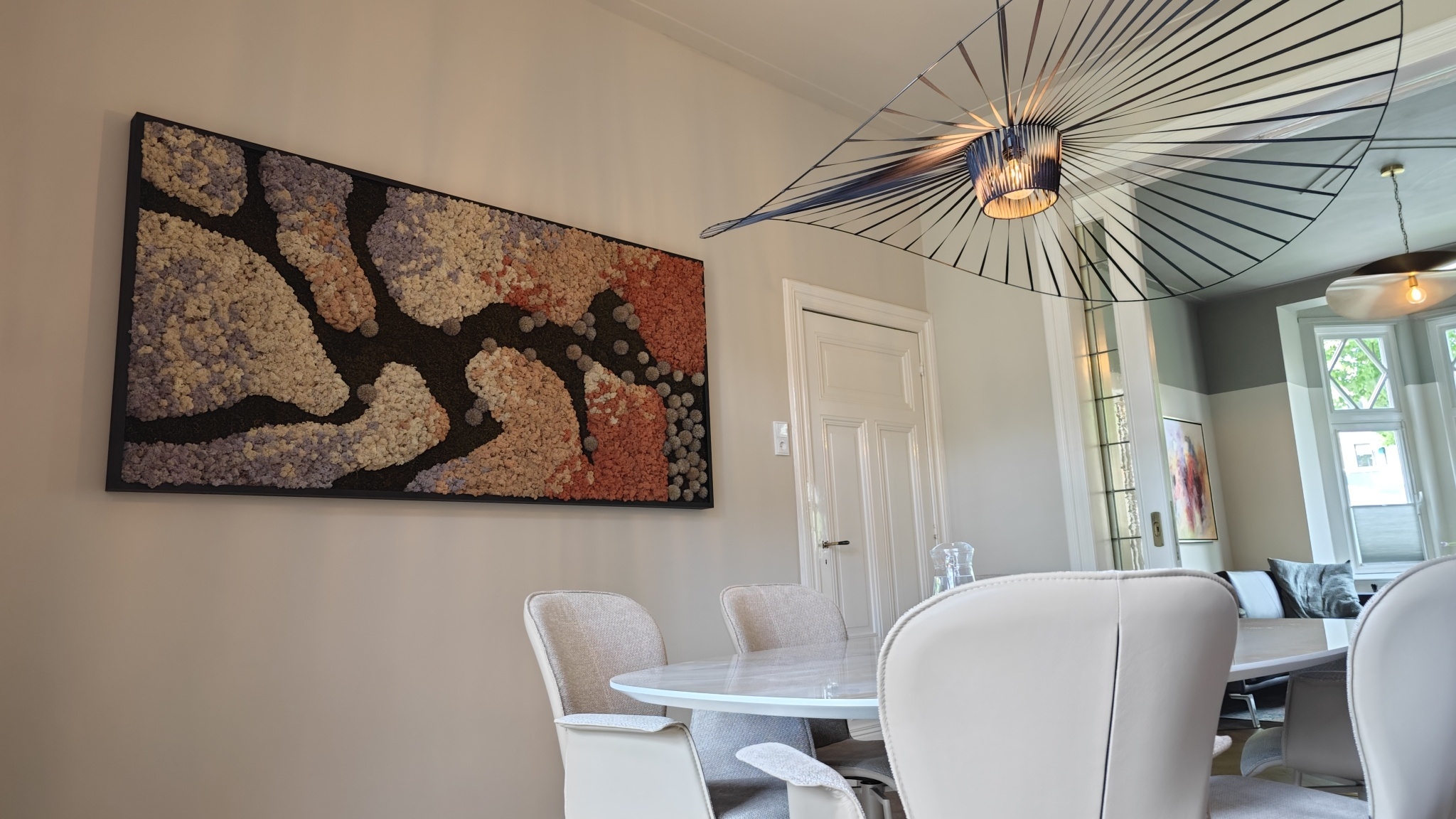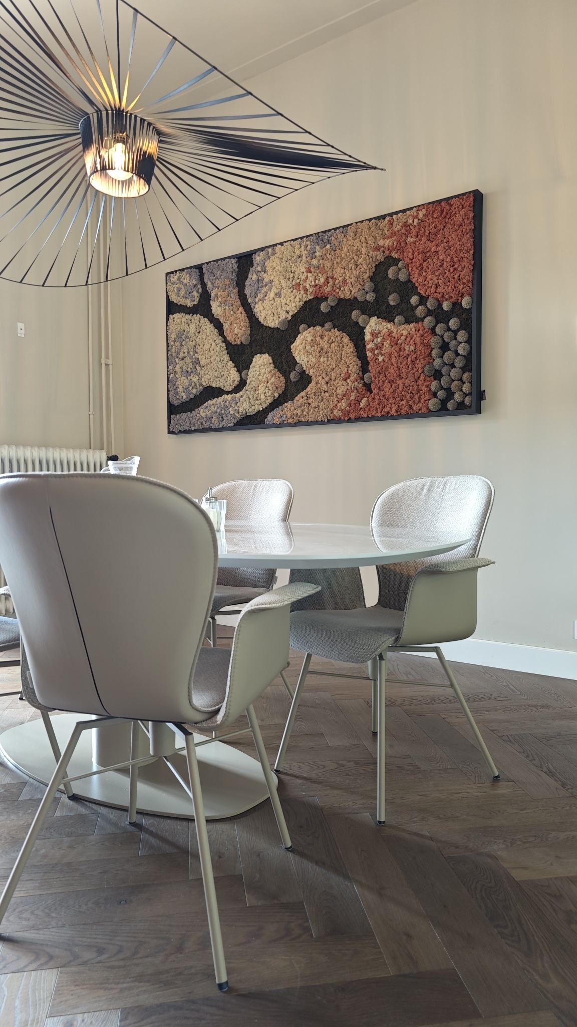Das Moosbild Lavi ist ein farbenfrohes Kunstwerk mit hellen, fröhlichen und erdigen Tönen für eine verspielte Ausstrahlung. Der tiefgrüne Farbton des Flachmooses in der Farbe Pine bildet eine natürliche Basis, während das weiche Rentiermoos in den lebendigen Farben Danae, Persici, Naturalis und Glaciem für ein spielerisches und blühendes Farbenspiel sorgt. Die subtilen Distelakzente verleihen zusätzliche Tiefe und Struktur, wodurch ein natürliches Gesamtbild mit vielen Höhenunterschieden entsteht. Dieses einzigartige Bild bringt Wärme und Atmosphäre in jeden Raum!