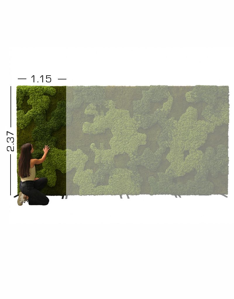• Das Moos ist 100 % natürlich, aber nicht mehr lebendig. Es wurde mit Salzen behandelt, wodurch es vollständig schwer entflammbar ist, keine Insekten anzieht und sein frisches Aussehen behält. Zudem verbessert die Wand die Akustik im Raum.