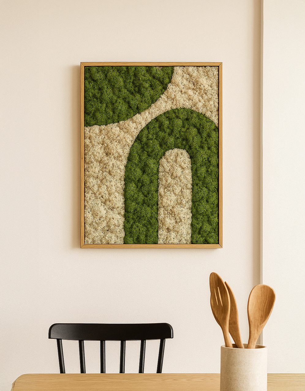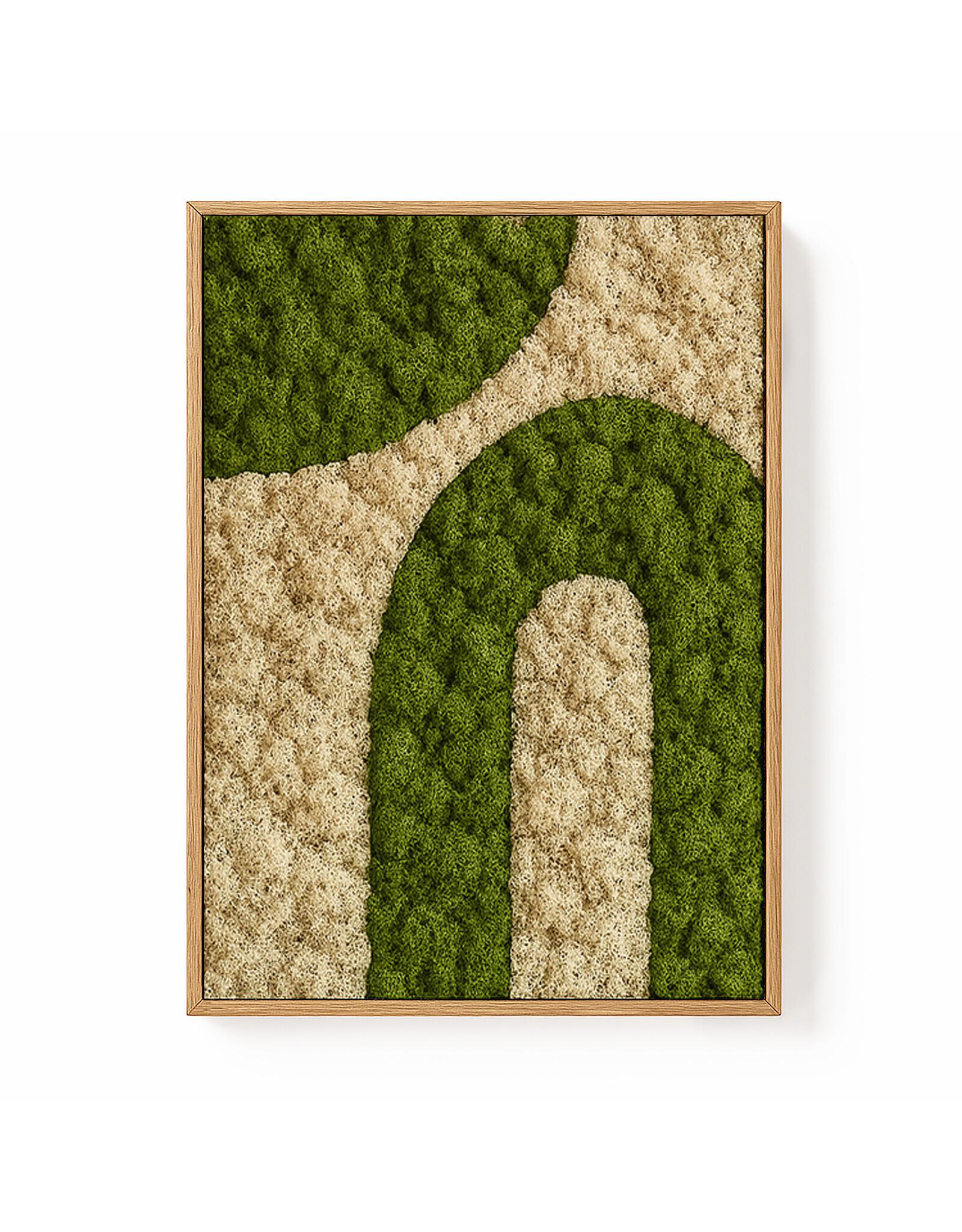 Erleben Sie die Kraft des Japandi-Designs, gefertigt aus echtem Moos in einer beruhigenden Komposition.Jedes Moosbild wird von Hand hergestellt, ist vollkommen pflegefrei und sofort bereit, stilvoll aufgehängt zu werden. Die klaren Linien gehen sanft in eine andere Moosfarbe über und erzeugen so einen beeindruckenden 3D-Effekt, der Ihrem Interieur Tiefe und Charakter verleiht.