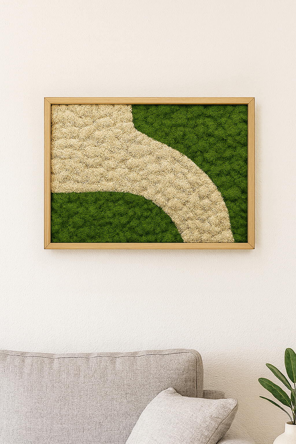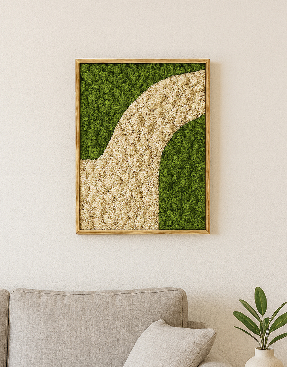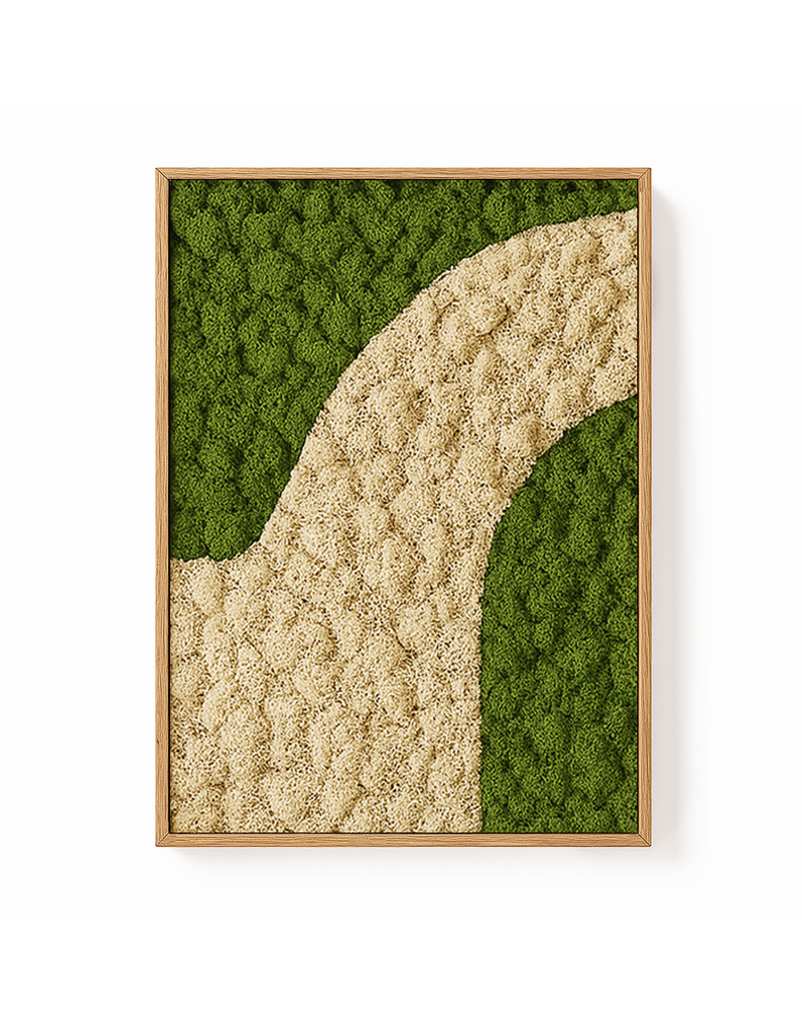 Erleben Sie die Kraft des Japandi-Designs, gefertigt aus echtem Moos in einer beruhigenden Komposition.Jedes Moosbild wird von Hand hergestellt, ist vollkommen pflegefrei und sofort bereit, stilvoll aufgehängt zu werden. Die klaren Linien gehen sanft in eine andere Moosfarbe über und erzeugen so einen beeindruckenden 3D-Effekt, der Ihrem Interieur Tiefe und Charakter verleiht.