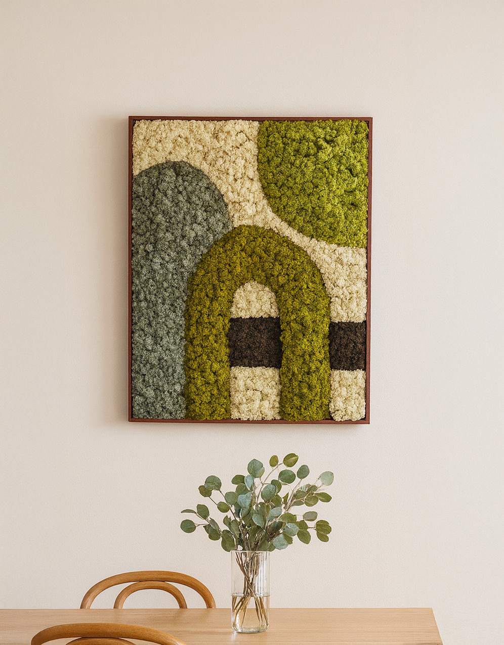Erleben Sie die Kraft des Japandi-Designs, gefertigt aus echtem Moos in einer beruhigenden Komposition. Jedes Moosbild wird von Hand hergestellt, ist vollkommen pflegefrei und sofort bereit, stilvoll aufgehängt zu werden. Die klaren Linien gehen sanft in eine andere Moosfarbe über und erzeugen so einen beeindruckenden 3D-Effekt, der Ihrem Interieur Tiefe und Charakter verleiht.