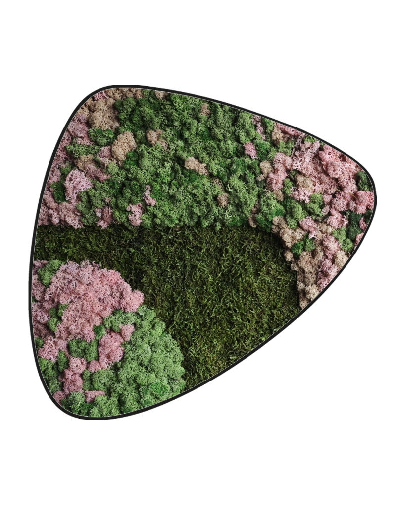Diese Moosbilder haben hauptsächlich verschiedene Grüntöne, von hellem frischem Grün bis zu tiefem Dunkelgrün. Dies wird oft mit sanften Akzenten in Rosa und Beige kombiniert, was für einen warmen und verspielten Effekt sorgt. Durch die Mischung aus Farben und verschiedenen Moosarten entsteht ein lebendiges Gesamtbild mit viel Tiefe. Das Bild hat eine natürliche und ruhige Ausstrahlung und erinnert ein wenig an eine kleine Landschaft.