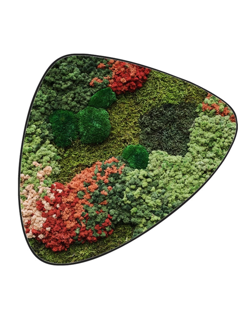 Das Moosbild Florielle ist aus einer Mischung von Rentiermoos, Flachmoos und Kugelmoos aufgebaut, wodurch ein schönes Relief entsteht. In der Mitte sind einige Kugelmoose verarbeitet, die dem Moosbild zusätzliche Tiefe verleihen. Im Design sind außerdem rote und rosafarbene Akzente aus Rentiermoos in den Farben Currant, Danae und Persici integriert, wodurch das Gesamtbild mehr Farbe und Variation erhält.