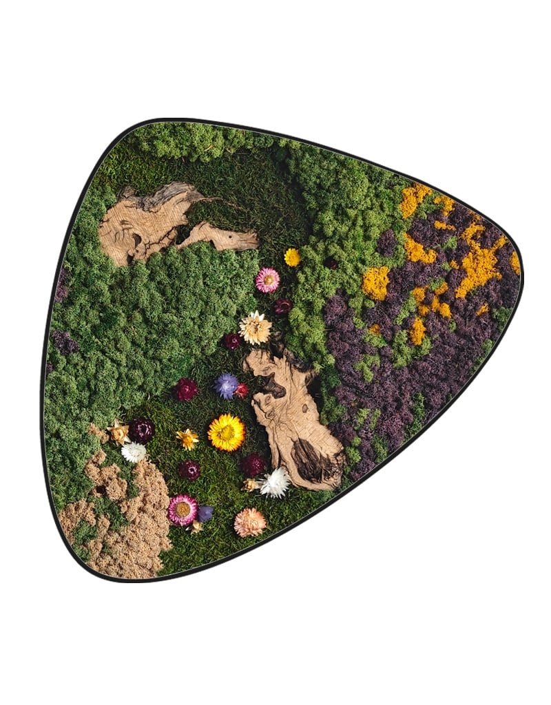 Im Moosbild Luvina werden verschiedene Moosarten mit Trockenblumen und natürlichen Holzelementen kombiniert. In der Mitte verläuft ein Fluss aus Flachmoos, umgeben von Trockenblumen in frischen, lebendigen Farben. Rund um diesen Fluss liegt eine Mischung aus Rentiermoos in Grün, Dunkelgrün, Lachs, Gelb und Lila. Eine wunderschöne und lebendige Ausstrahlung, die dein Interieur auf natürliche Weise auffrischt.