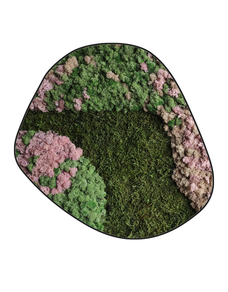 Dieses Moosbild hat eine verspielte, organische Form, die sofort ins Auge fällt. Die Kombination verschiedener Moosarten sorgt für ein lebendiges und natürliches Gesamtbild. Hellgrünes Flachmoos bildet das Herz des Designs und verleiht Ruhe und Tiefe. Darum herum liegen hellere Moostöne, beiges und zartrosa Rentiermoos. Diese Farben gehen fließend ineinander über und sorgen für einen schönen Kontrast.