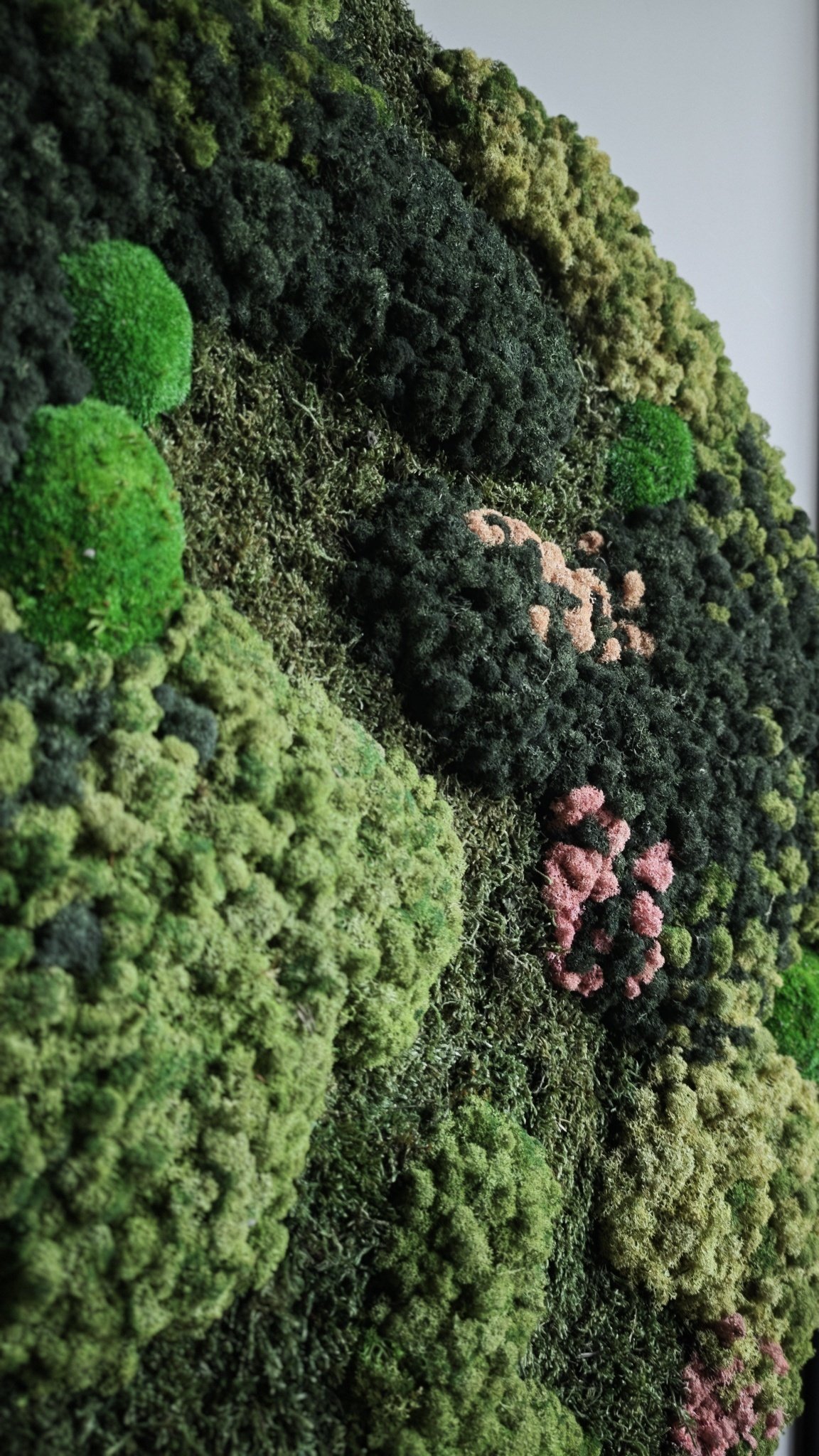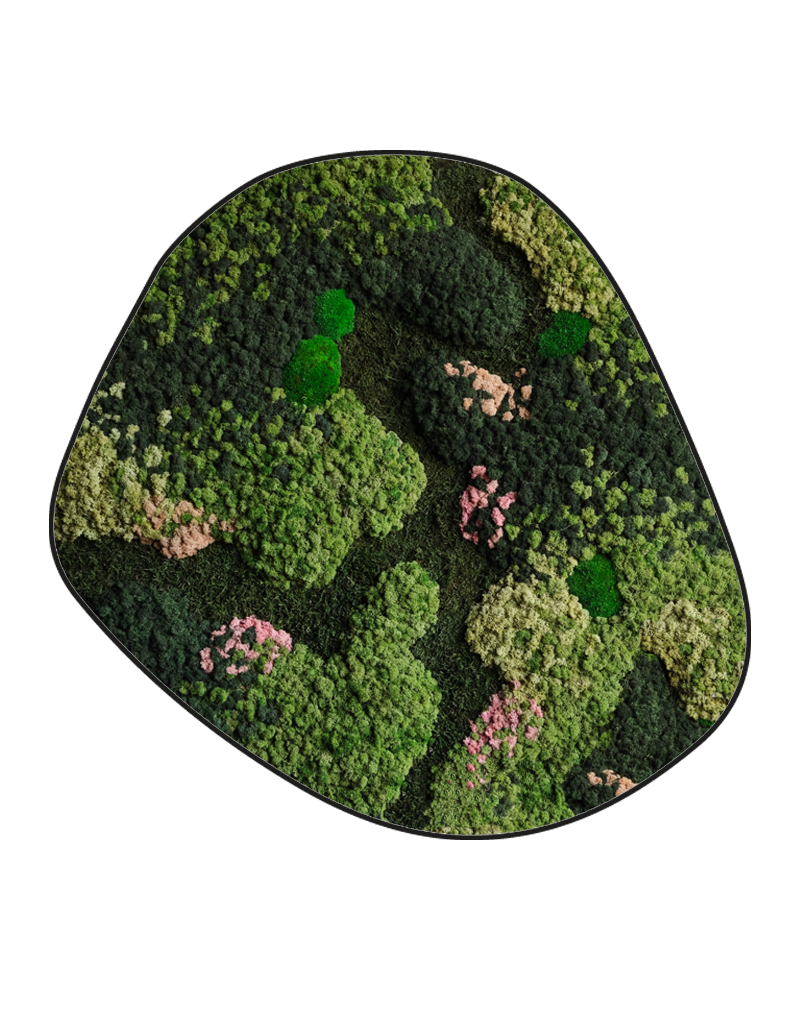 Die Moosvariante FLOW besteht aus einem Moosmix mit einer natürlichen, flussähnlichen Struktur. In diesem Moosbild bildet dunkles Flachmoos ein Tal, das mit Rentiermoos in den Farben Dimidium, Pine und Vetus zusammenläuft. Als Akzente sind zwei sanfte Rosatöne eingearbeitet, Rentiermoos Rozea und lachsfarbiges Danae. Kugelmoos ist dezent integriert und sorgt für zusätzliche Tiefe und Struktur. Ein eleganter Moosstil mit einer feinen roséfarbenen Note, ein echter Blickfang für jeden Raum.