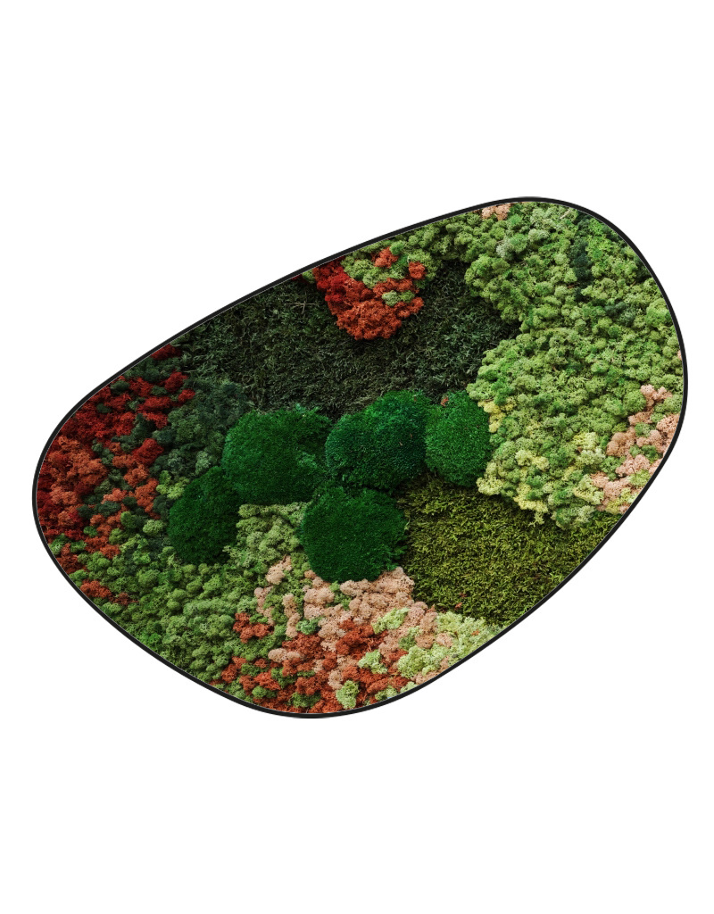 Das Moosbild Florielle ist aus einer Mischung von Rentiermoos, Flachmoos und Kugelmoos aufgebaut, wodurch ein schönes Relief entsteht. In der Mitte sind einige Kugelmoose verarbeitet, die dem Moosbild zusätzliche Tiefe verleihen. Im Design sind außerdem rote und rosafarbene Akzente aus Rentiermoos in den Farben Currant, Danae und Persici integriert, wodurch das Gesamtbild mehr Farbe und Variation erhält.