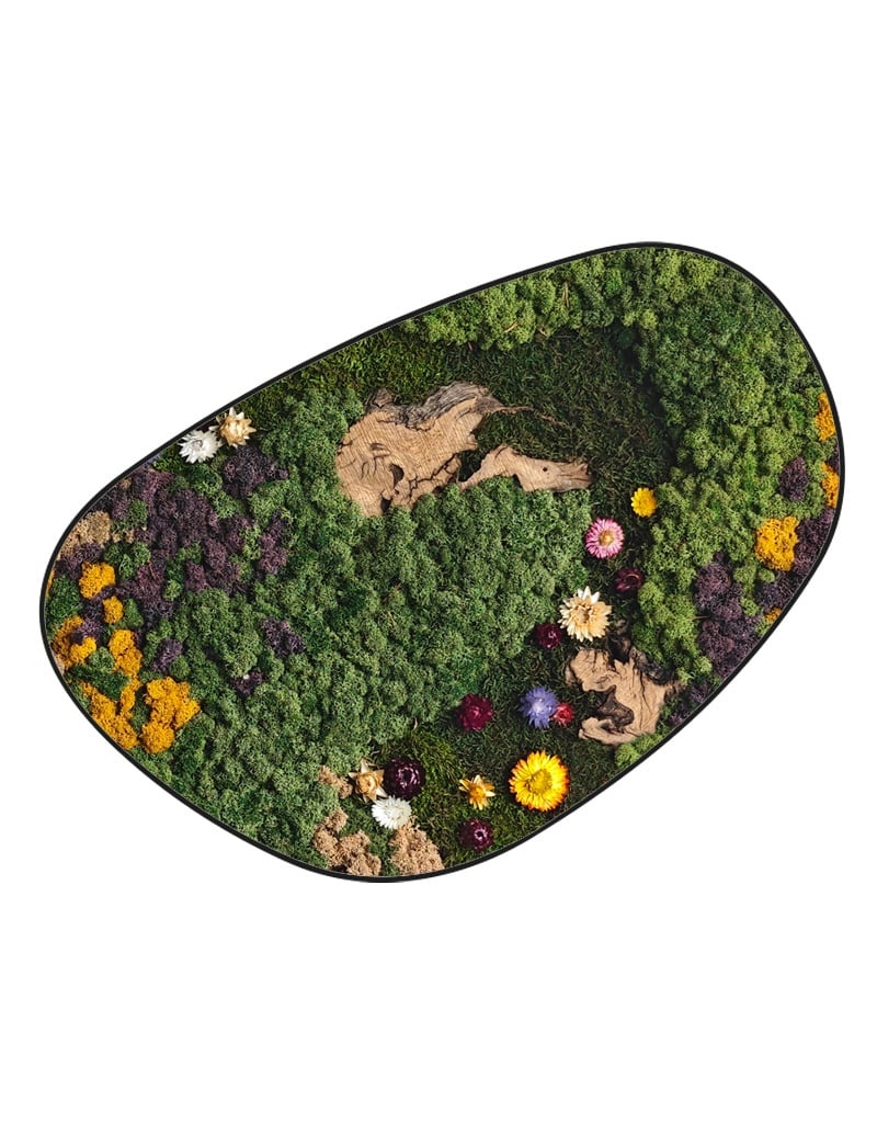 Im Moosbild Luvina werden verschiedene Moosarten mit Trockenblumen und natürlichen Holzelementen kombiniert. In der Mitte verläuft ein Fluss aus Flachmoos, umgeben von Trockenblumen in frischen, lebendigen Farben. Rund um diesen Fluss liegt eine Mischung aus Rentiermoos in Grün, Dunkelgrün, Lachs, Gelb und Lila. Eine wunderschöne und lebendige Ausstrahlung, die dein Interieur auf natürliche Weise auffrischt.