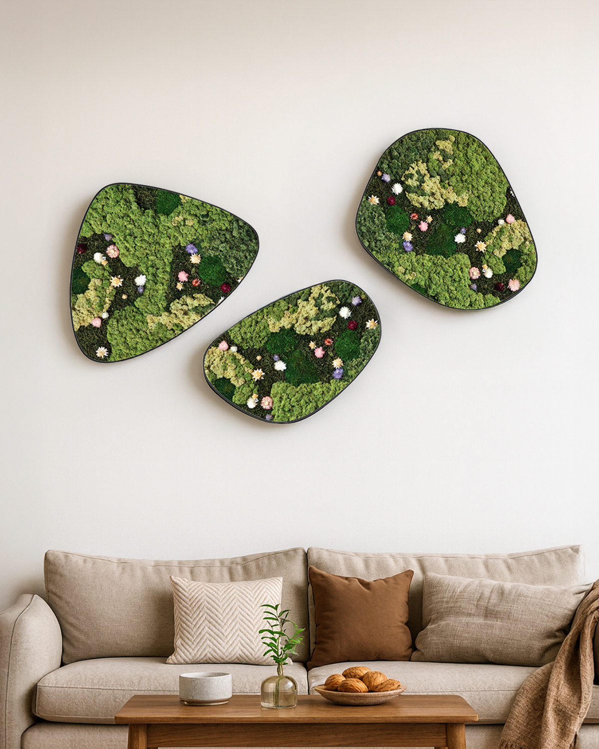 In der Moos-Variante Flora haben wir getrocknete Blumen mit Moos kombiniert. Beide sind ein Naturprodukt, das sich gegenseitig verstärkt. Die Blumen haben zarte rosa/violette und weiße Farbtöne. Dieses Moosbild erhellt das Interieur und hat einen frischen Look.