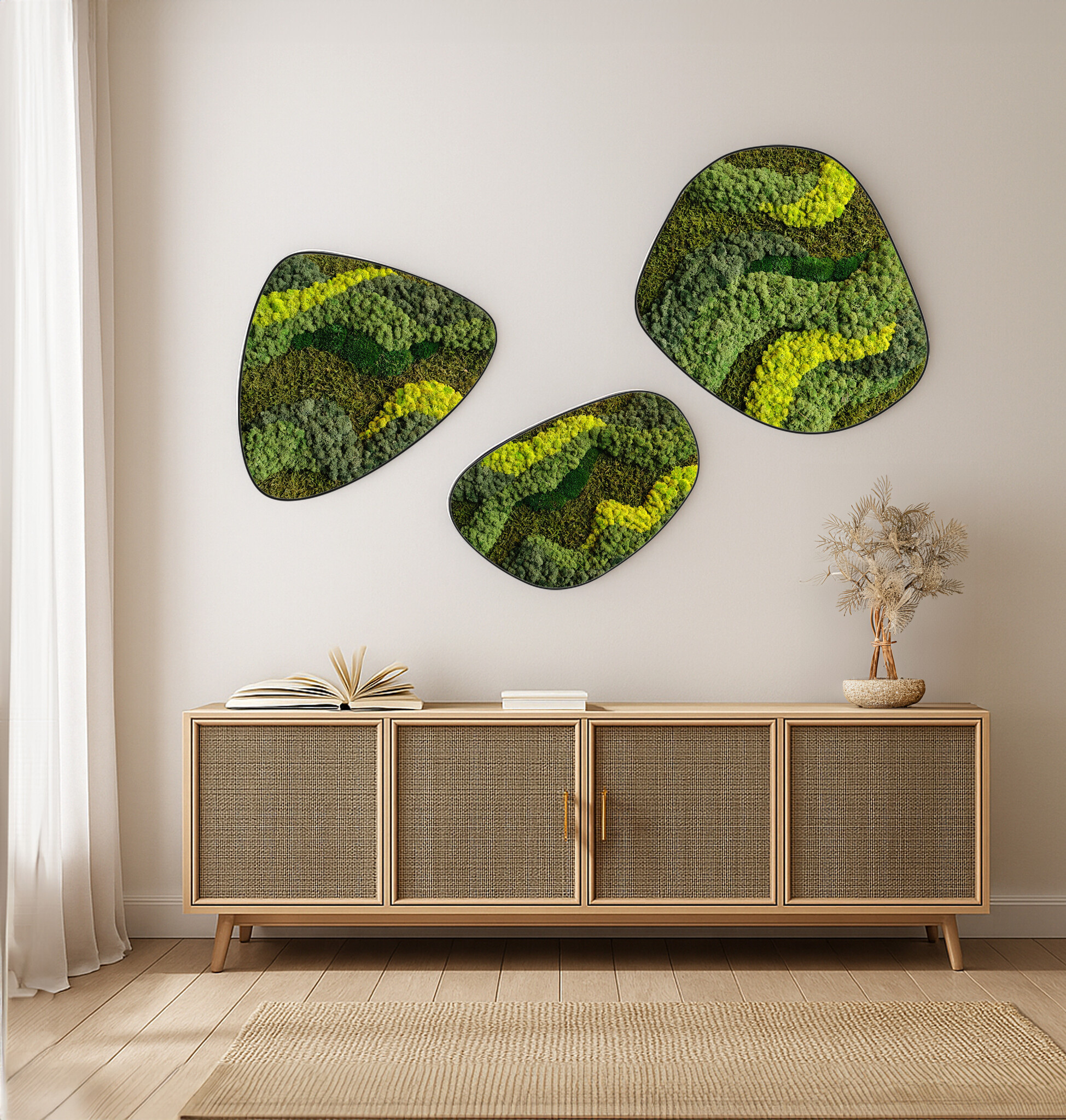 Die Maße werden an der breitesten Stelle gemessen. Die Abbildung zeigt das Muster eines Moosdots-Set Moosbild in der Größe 100-100-100 cm (Set 4). Da es sich um ein Naturprodukt handelt, ist jedes Moosbild ein Unikat. Daher kann das Layout des gekauften Moosbildes von dem ausgewählten Foto abweichen. Sollten Sie eine andere Größe benötigen? Bitte kontaktieren Sie uns unter [email protected]