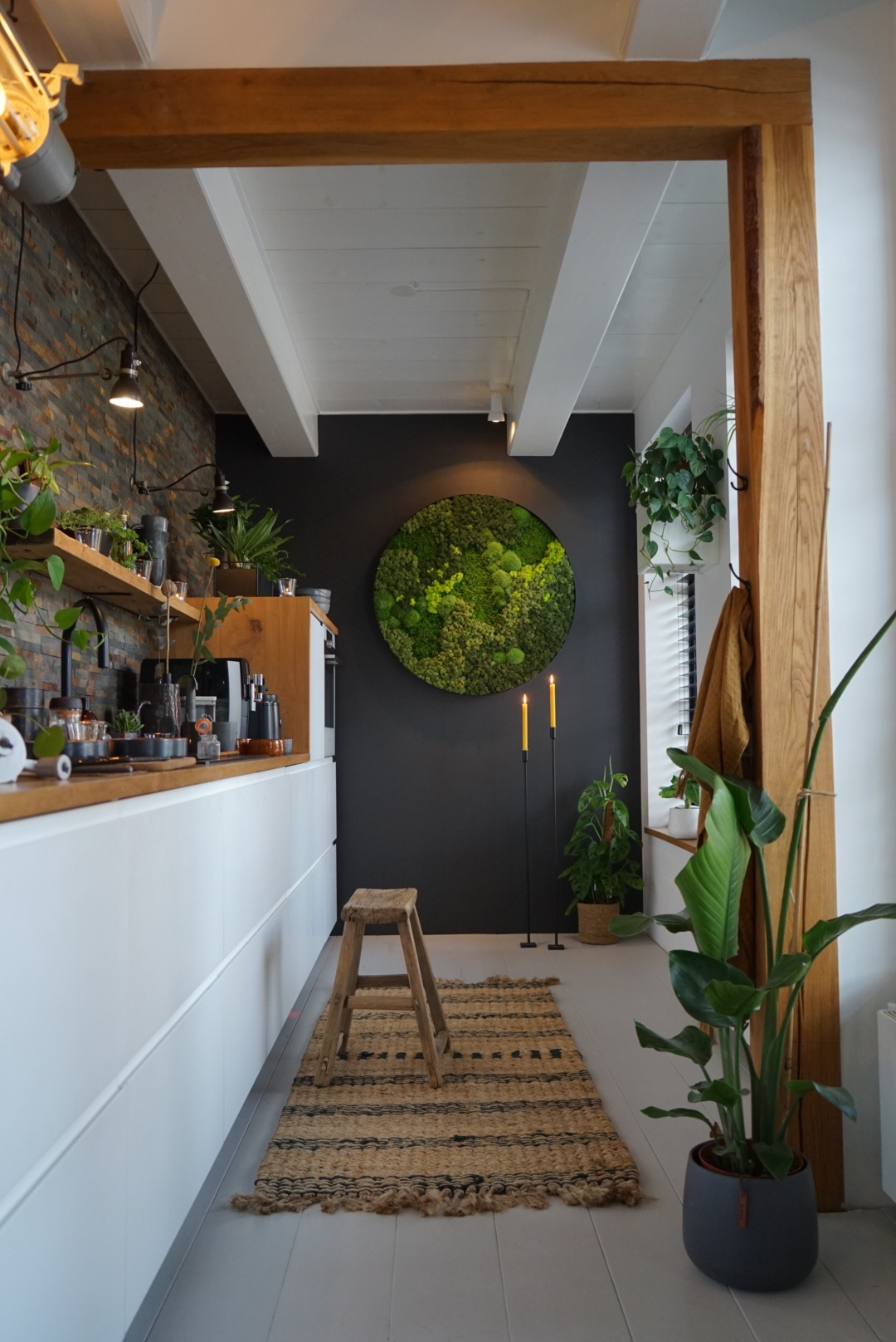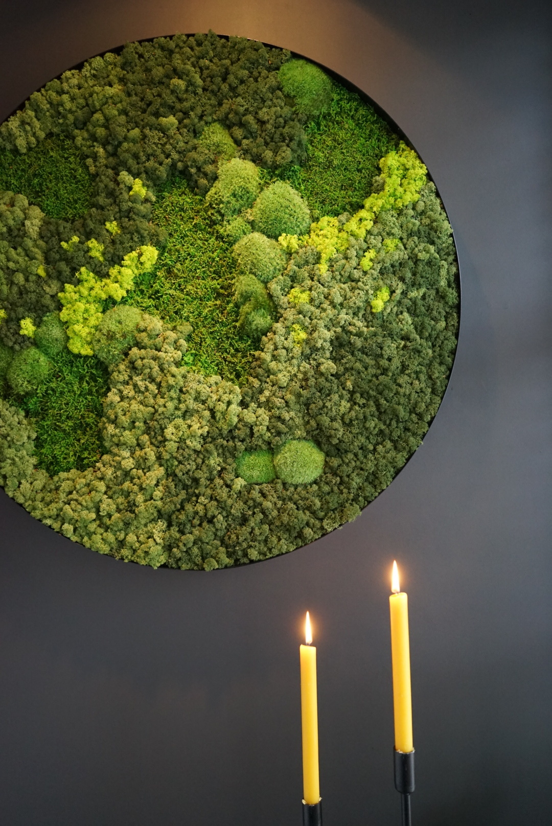 Mit einem runden Moosbild wird ein schlichtes Interieur aufgelockert. Wussten Sie, dass unsere runden Mooszirkel mit Stahlrand auch in einem industriellen Interieur gut aussehen? Das weiche, natürliche Aussehen des Mooses ist eine wunderbare Ergänzung zu den häufig verwendeten "harten" Materialien wie Beton, Stahl und Glas.