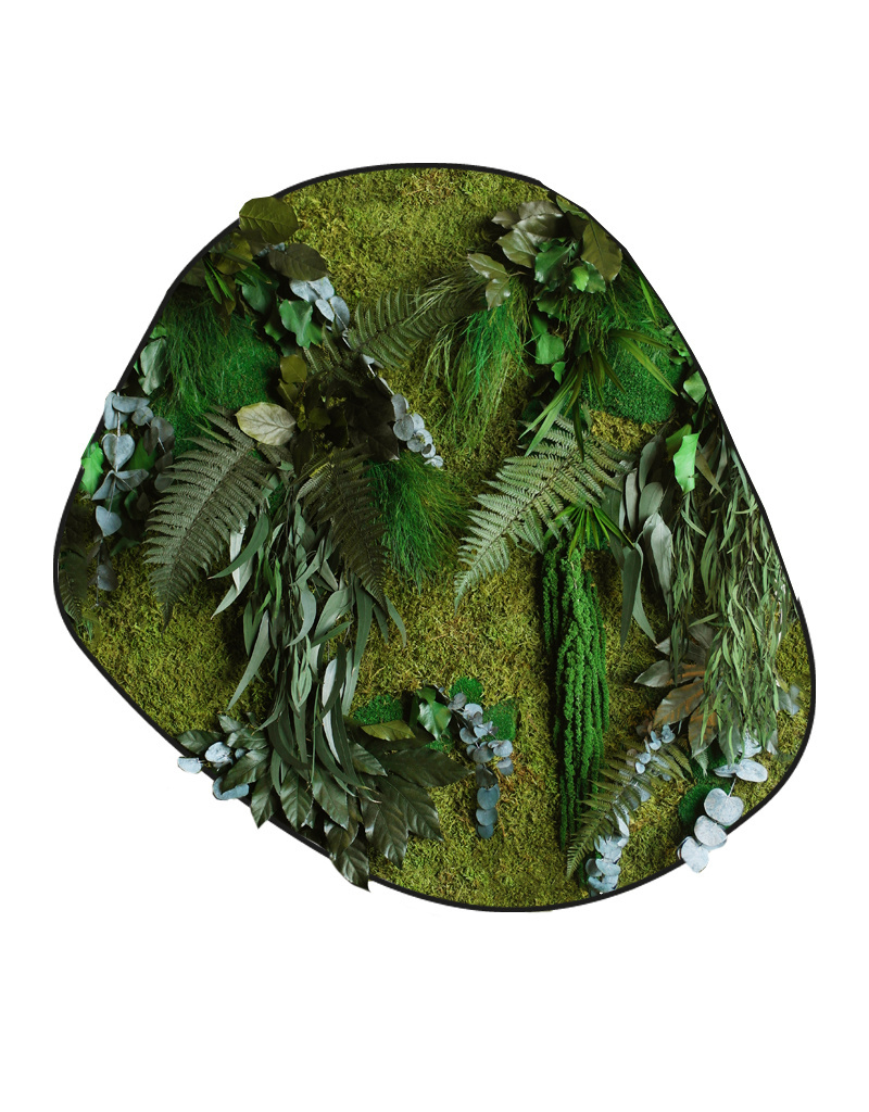 Die Moosart Jane besteht zu 50 % aus Moosen und zu 50 % aus Dschungel. Der Dschungel hat eine große Vielfalt an Pflanzen, Farnen und Blättern. Diese schöne Mischung aus verschiedenen Formen und Farben schafft einen echten Urban Jungle. Auch diese Variante erfordert keine Pflege. Wir bereiten die Farne, Pflanzen und Blätter auf die gleiche Weise vor wie die Moose. Diese Behandlung sorgt dafür, dass das Dschungelgemälde über Jahre hinweg schön bleibt.