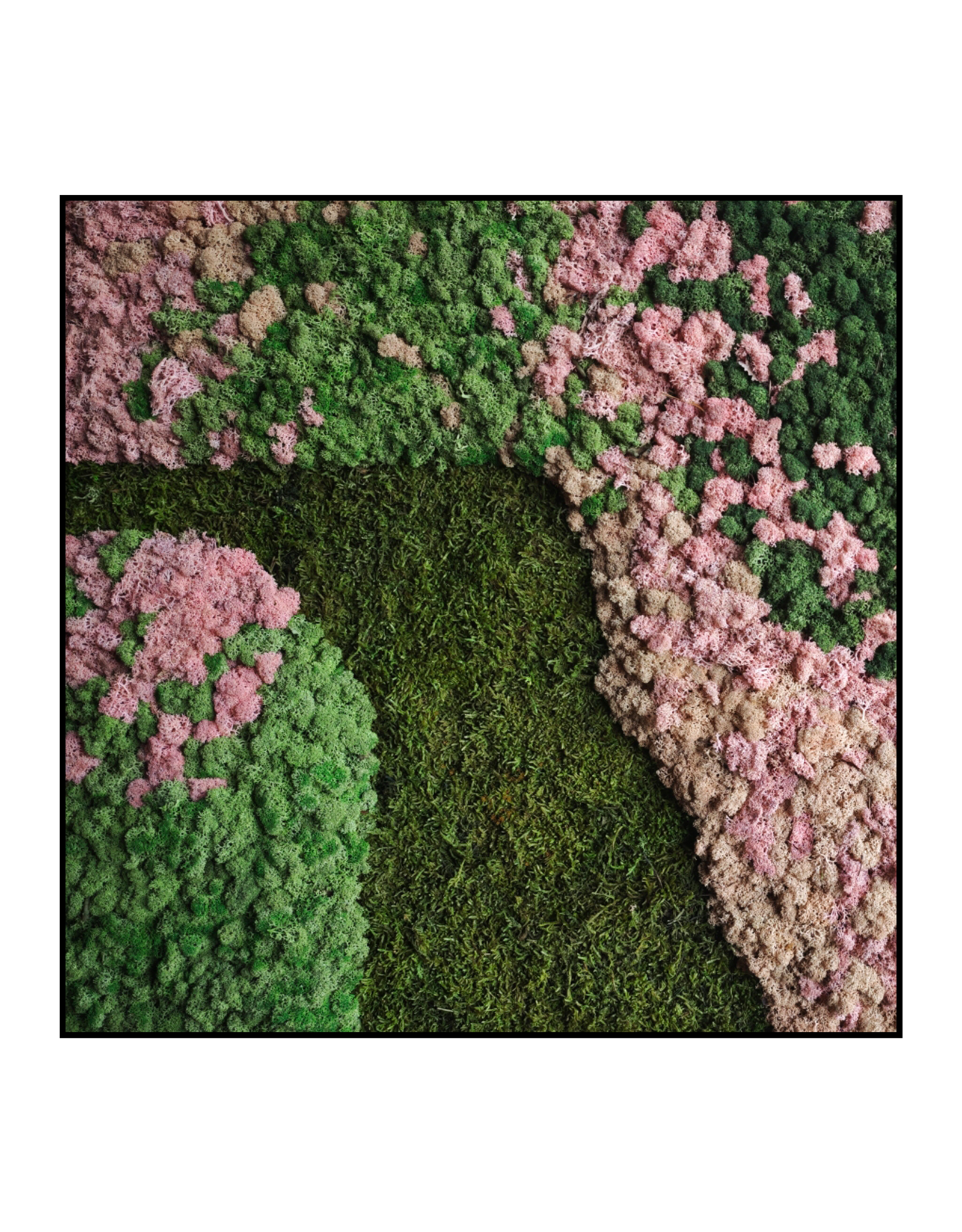 Diese Moosbilder haben hauptsächlich verschiedene Grüntöne, von hellem frischem Grün bis zu tiefem Dunkelgrün. Dies wird oft mit sanften Akzenten in Rosa und Beige kombiniert, was für einen warmen und verspielten Effekt sorgt. Durch die Mischung aus Farben und verschiedenen Moosarten entsteht ein lebendiges Gesamtbild mit viel Tiefe. Das Bild hat eine natürliche und ruhige Ausstrahlung und erinnert ein wenig an eine kleine Landschaft.