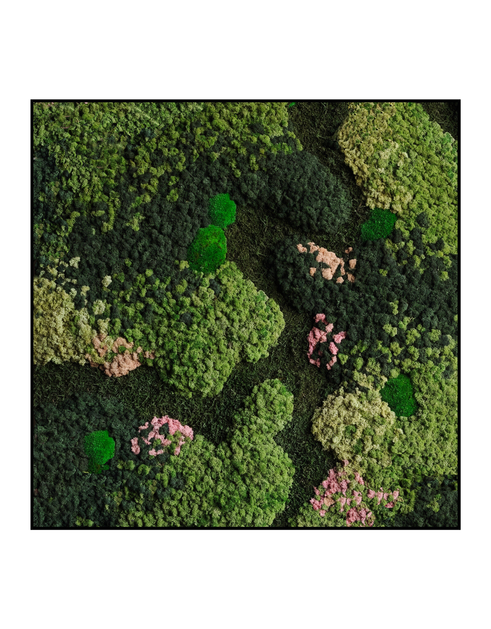 Die Moosvariante FLOW besteht aus einem Moosmix mit einer natürlichen, flussähnlichen Struktur. In diesem Moosbild bildet dunkles Flachmoos ein Tal, das mit Rentiermoos in den Farben Dimidium, Pine und Vetus zusammenläuft. Als Akzente sind zwei sanfte Rosatöne eingearbeitet, Rentiermoos Rozea und lachsfarbiges Danae. Kugelmoos ist dezent integriert und sorgt für zusätzliche Tiefe und Struktur. Ein eleganter Moosstil mit einer feinen roséfarbenen Note, ein echter Blickfang für jeden Raum.