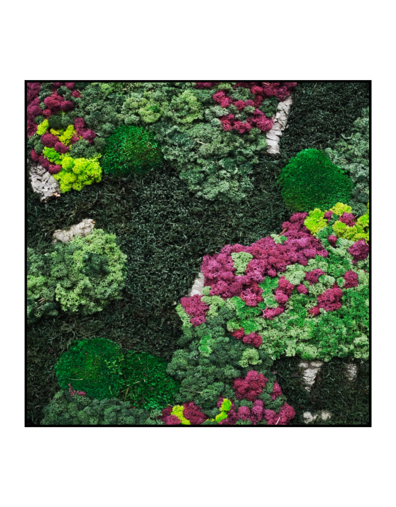 Ein lebendiger Moosbild mit verschiedenen Strukturen und Grüntönen, kombiniert mit verspielten Akzenten aus bordeauxfarbenem und Rentiermoos in der Farbe Apricis. Dunkles Flachmoos sorgt für natürliche Tiefe, während helleres Rentiermoos und kleine Stücke Baumrinde das Gesamtbild wie eine Miniatur-Waldlandschaft wirken lassen.