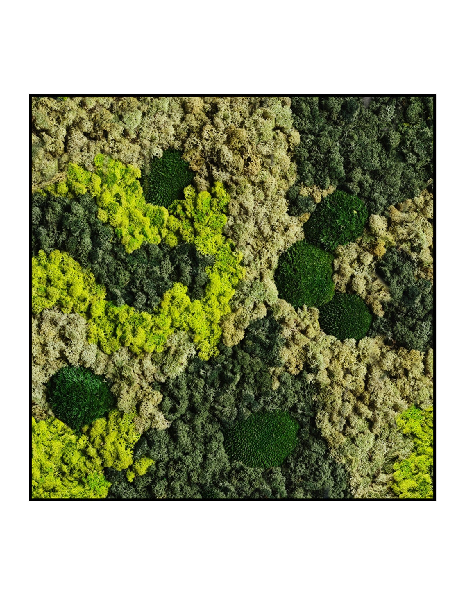 Dieses Moosbild aus Rentiermoos und Kugelmoos ist sofort an den ruhigen organischen Linien erkennbar, die sich durch das gesamte Werk ziehen. Die sanften Wellen des Rentiermooses bilden ein natürliches Design und die verschiedenen Grüntöne machen das Bild für viele Einrichtungsstile geeignet.