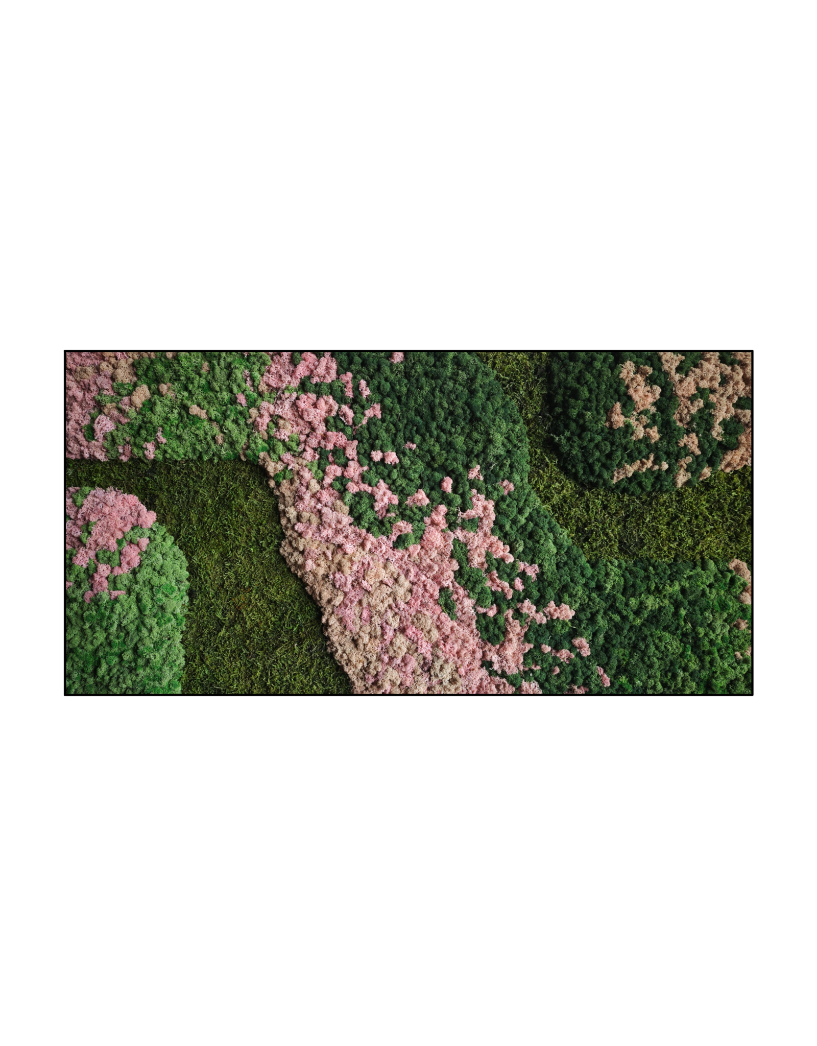 Diese Moosbilder haben hauptsächlich verschiedene Grüntöne, von hellem frischem Grün bis zu tiefem Dunkelgrün. Dies wird oft mit sanften Akzenten in Rosa und Beige kombiniert, was für einen warmen und verspielten Effekt sorgt. Durch die Mischung aus Farben und verschiedenen Moosarten entsteht ein lebendiges Gesamtbild mit viel Tiefe. Das Bild hat eine natürliche und ruhige Ausstrahlung und erinnert ein wenig an eine kleine Landschaft.