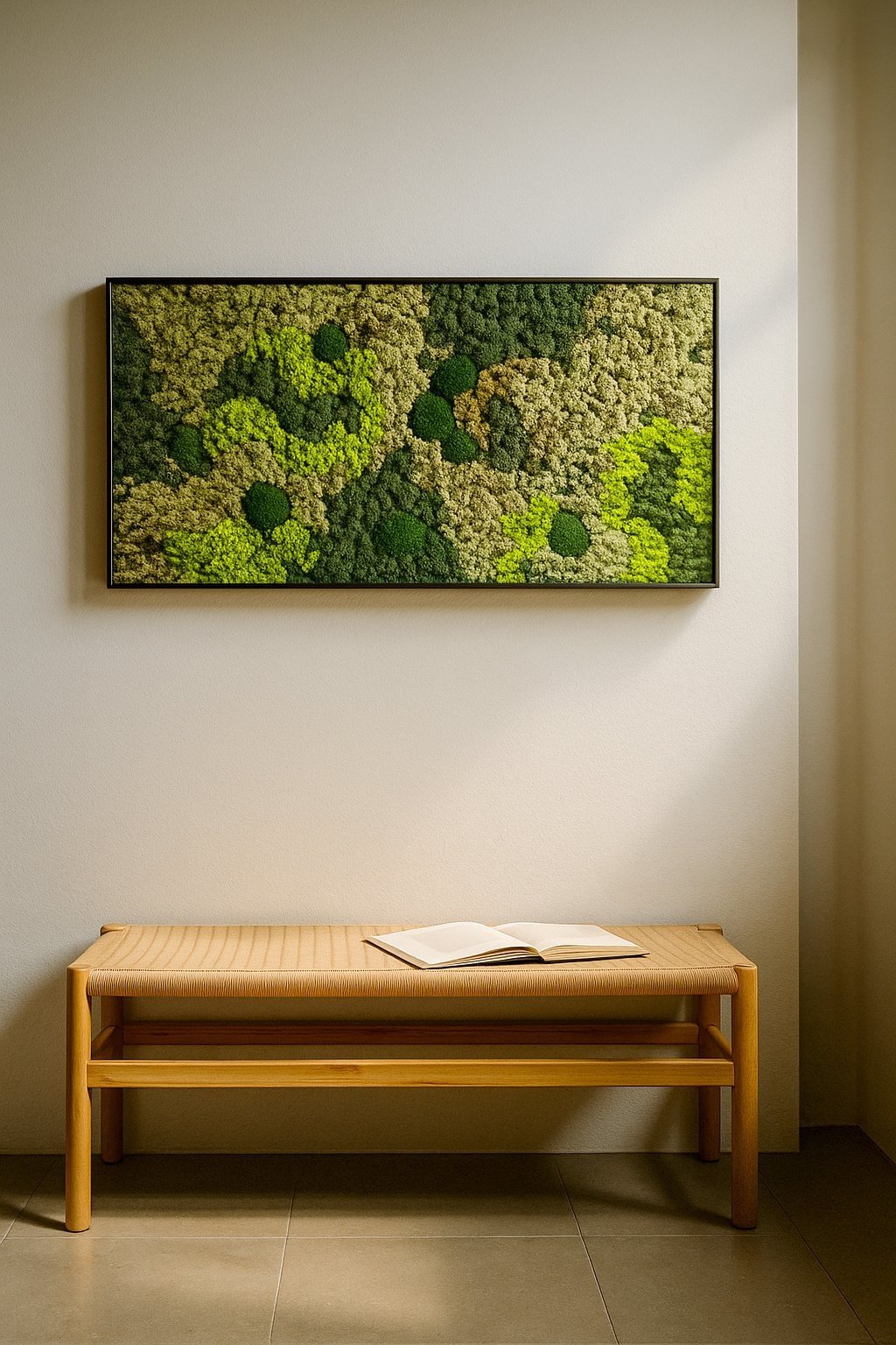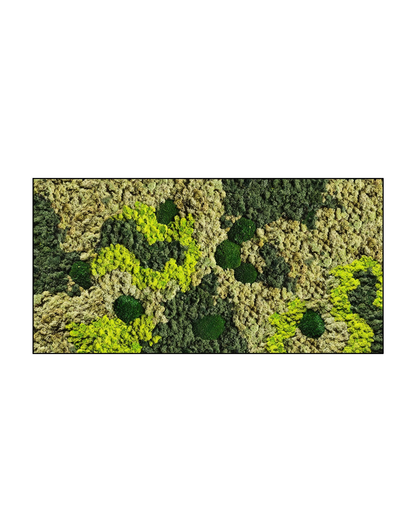 Dieses Moosbild aus Rentiermoos und Kugelmoos ist sofort an den ruhigen organischen Linien erkennbar, die sich durch das gesamte Werk ziehen. Die sanften Wellen des Rentiermooses bilden ein natürliches Design und die verschiedenen Grüntöne machen das Bild für viele Einrichtungsstile geeignet.
