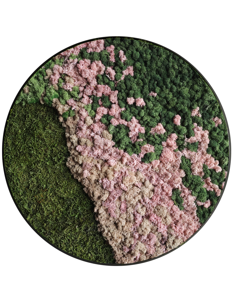 Dieser runde Moosbild ist ein harmonisches Zusammenspiel aus natürlichen Strukturen, Farben und Tiefe. In diesem Moosbild entfaltet sich eine organische Landschaft, die sofort die Aufmerksamkeit auf sich zieht. Die Komposition besteht aus verschiedenen Moosarten, jede mit ihrer eigenen Textur und Farbintensität. Hell Flachmoos bildet eine ruhige Basis und sorgt für ein Gefühl von Stabilität und Tiefe.