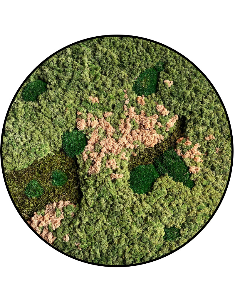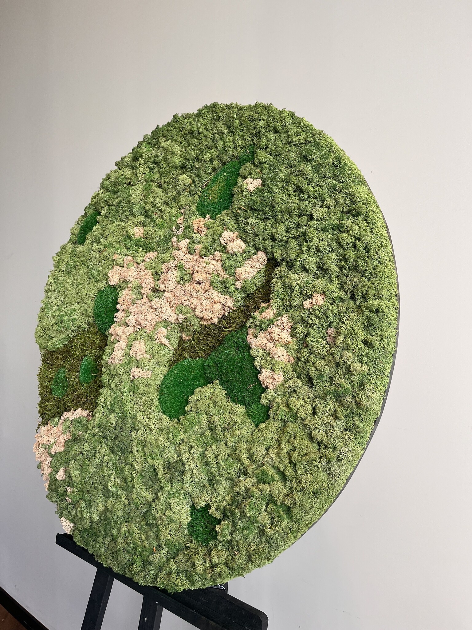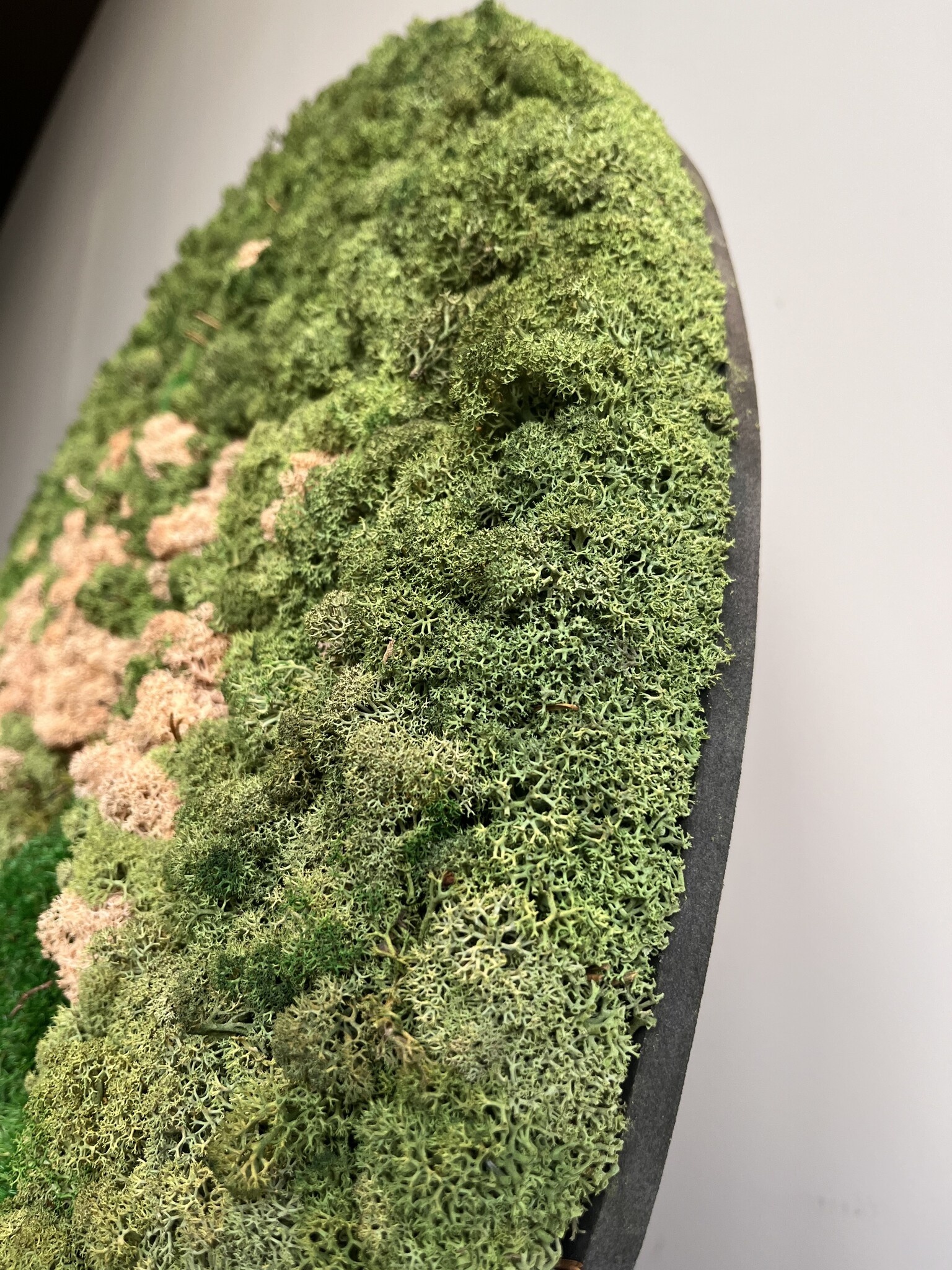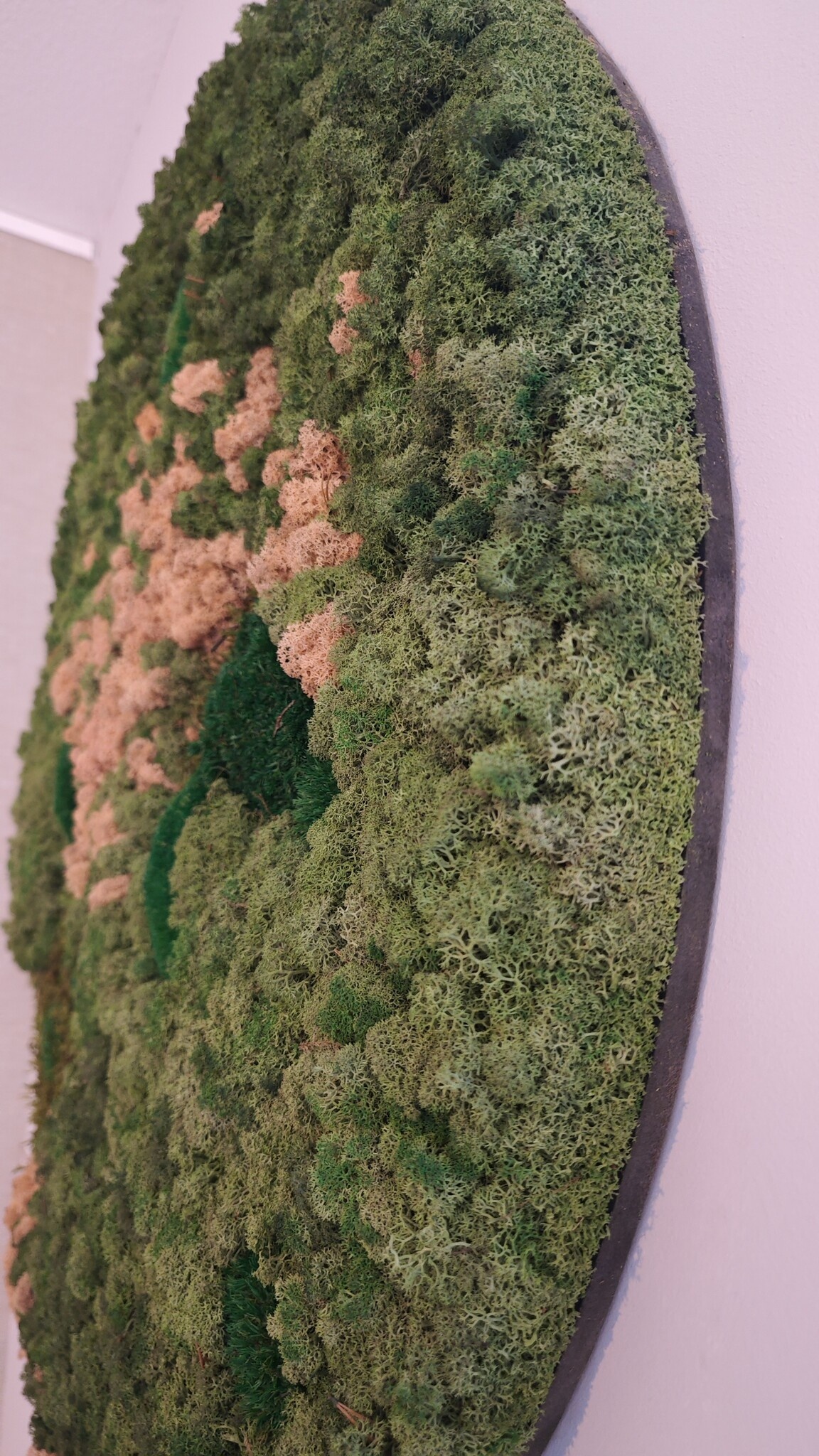 Moosvariante Rosaine ist ein harmonischer Mooskreis aus Rentier-, Flach- und Kugelmoos in tiefen Grüntönen. Sanfte Rosatöne durchbrechen das Grün und verleihen dem Kunstwerk eine frische, verspielte Note, die jedem Interieur einen stilvollen, natürlichen Akzent gibt.