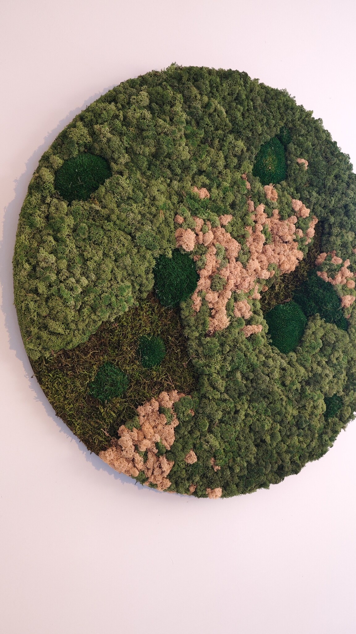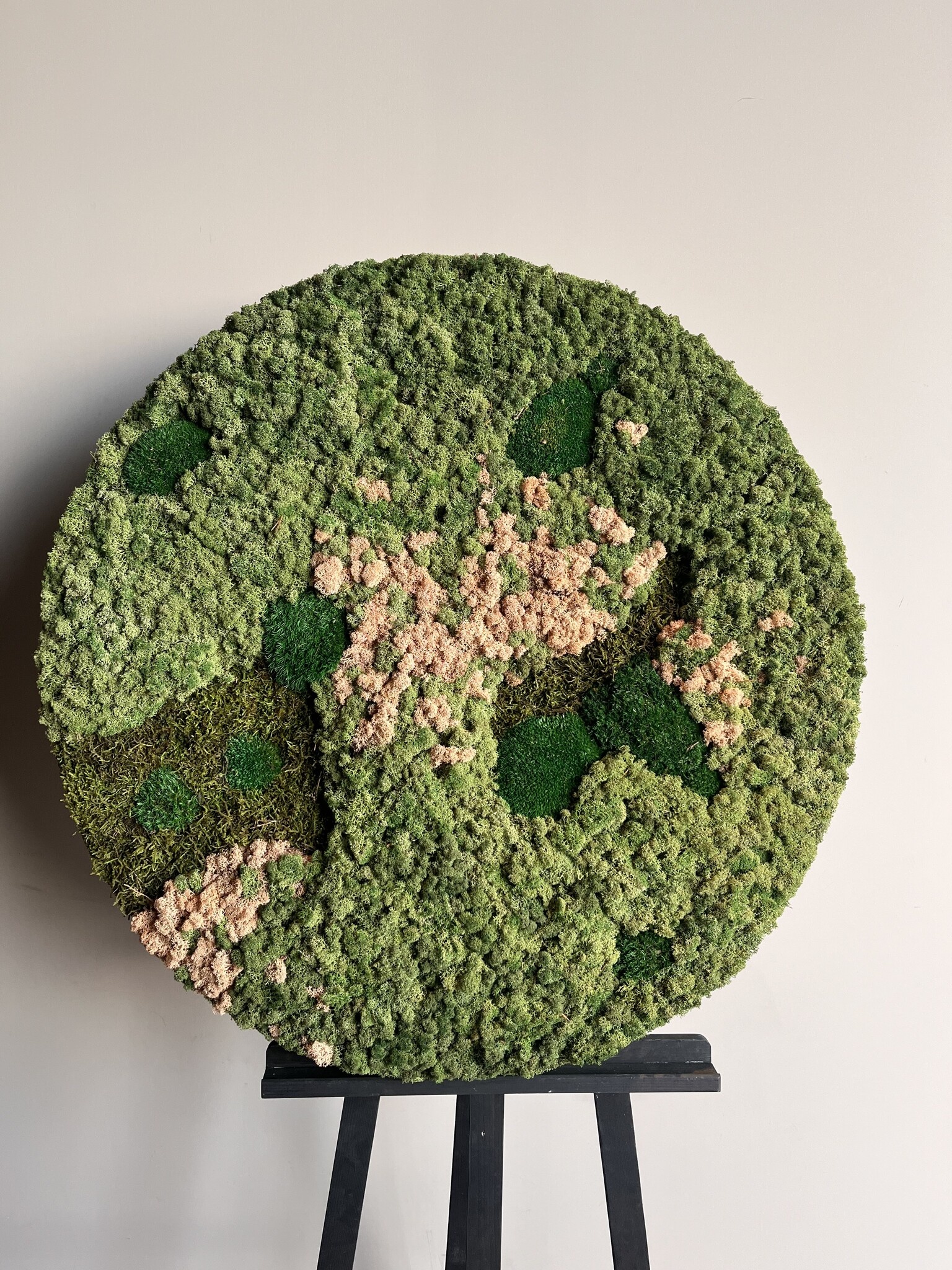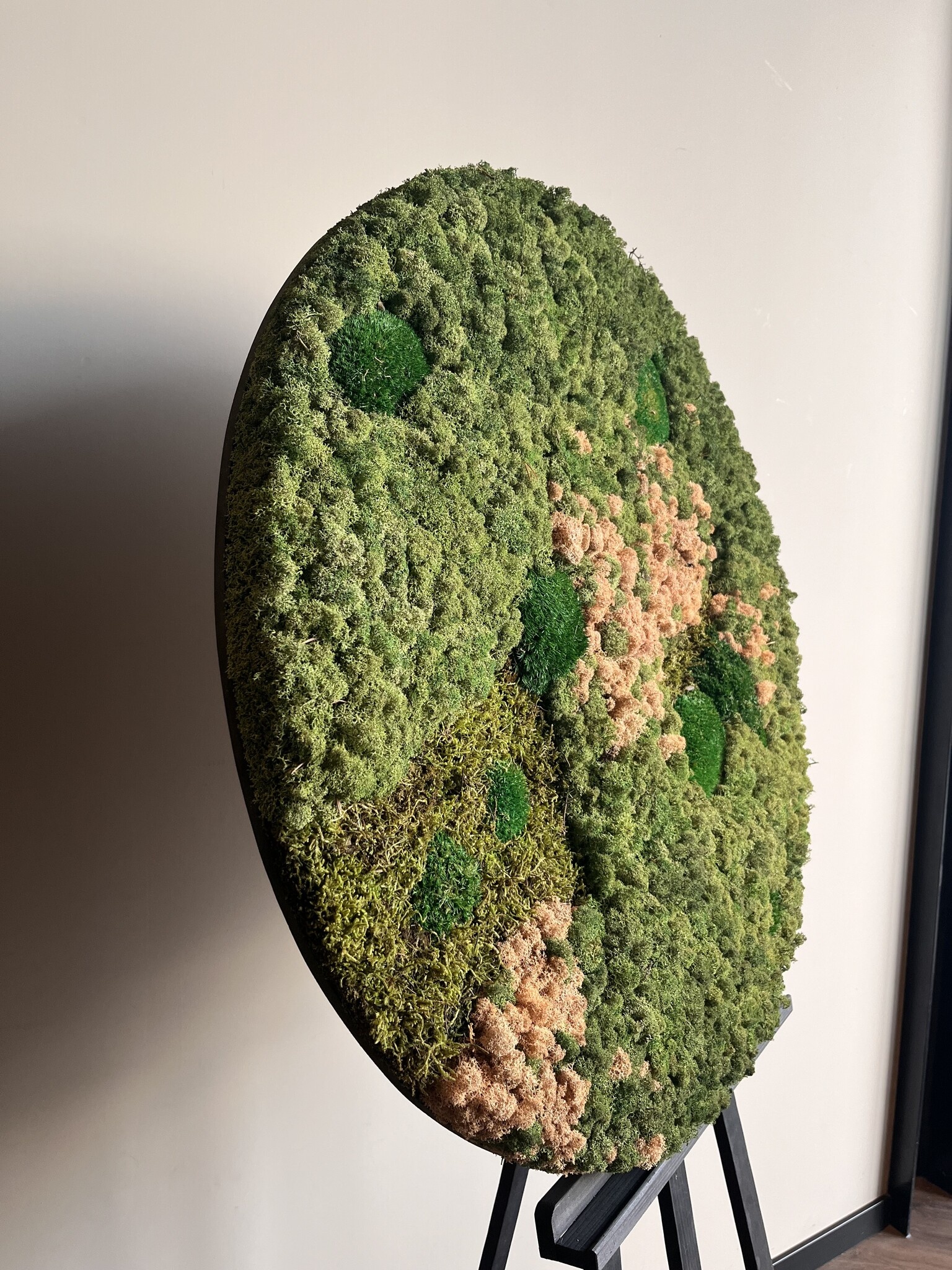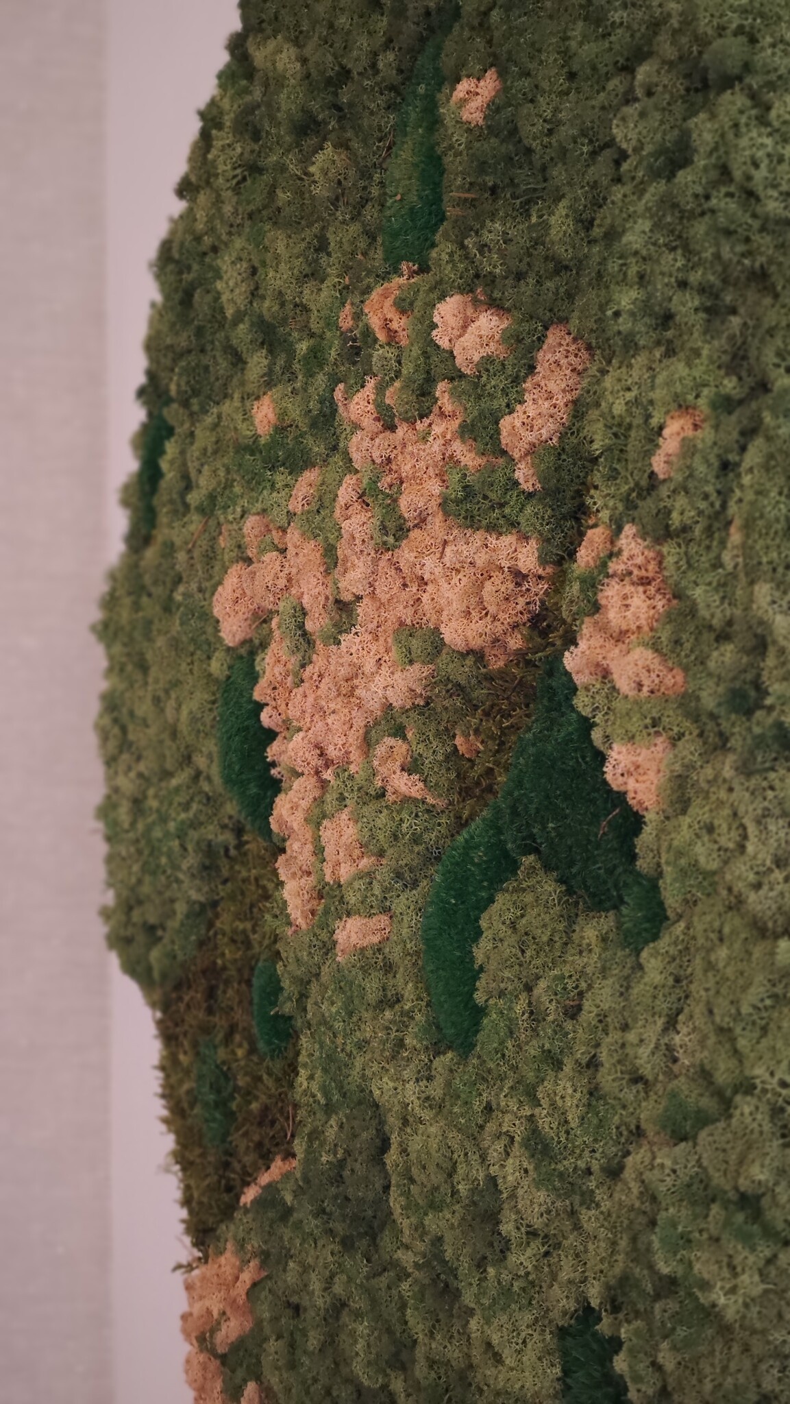 Moosvariante Rosaine ist ein harmonischer Mooskreis aus Rentier-, Flach- und Kugelmoos in tiefen Grüntönen. Sanfte Rosatöne durchbrechen das Grün und verleihen dem Kunstwerk eine frische, verspielte Note, die jedem Interieur einen stilvollen, natürlichen Akzent gibt.