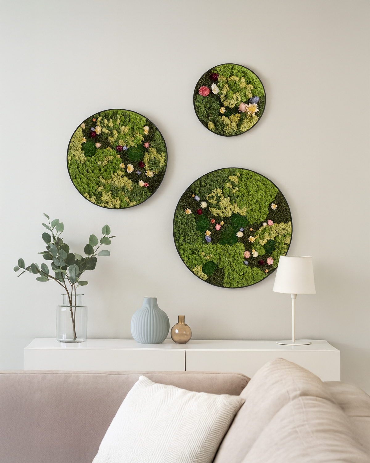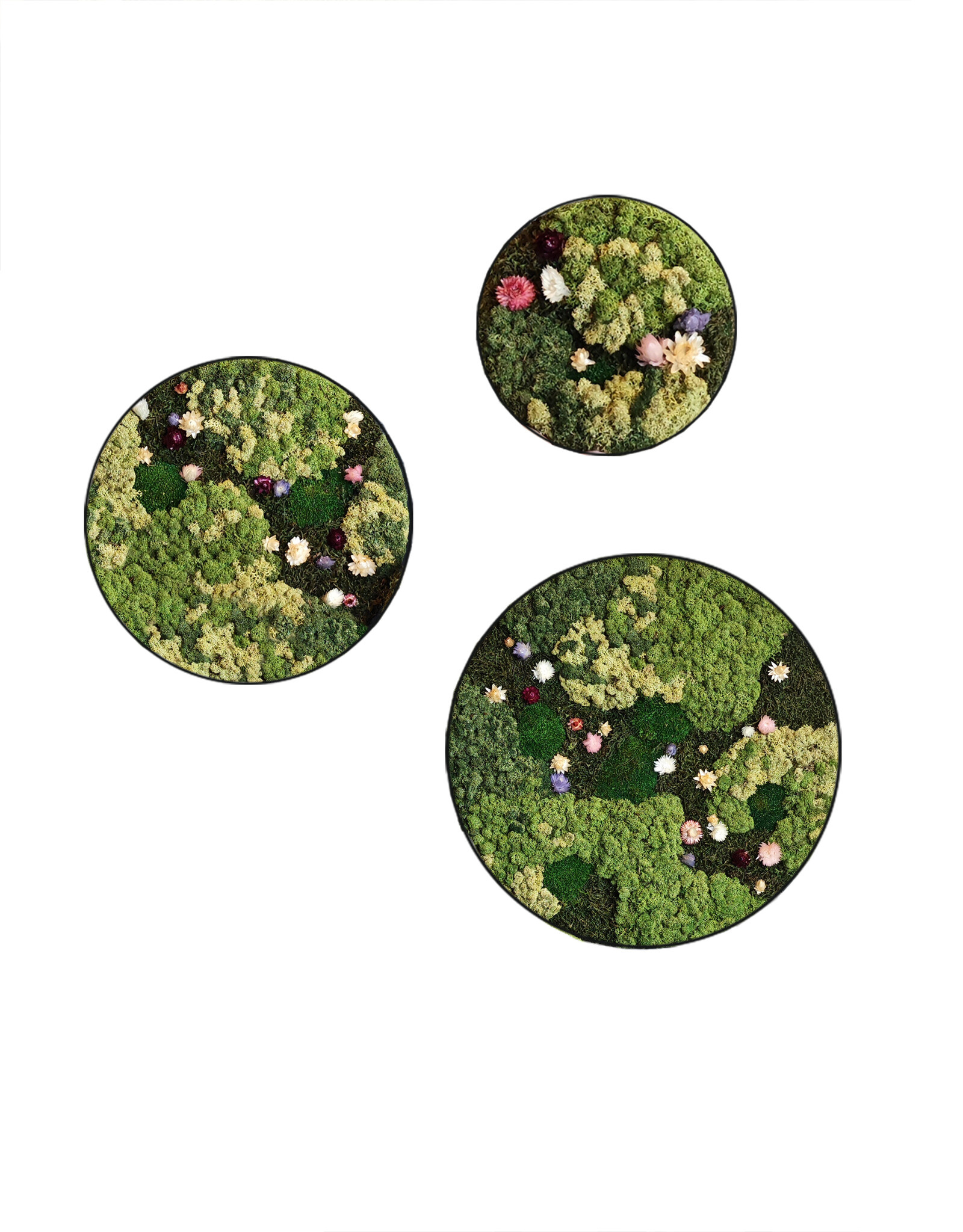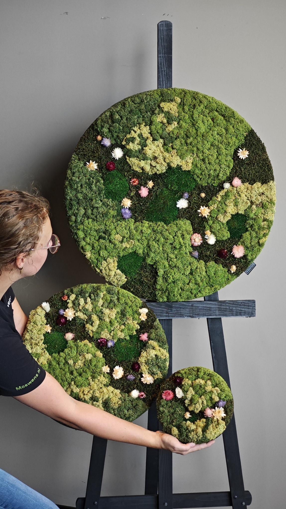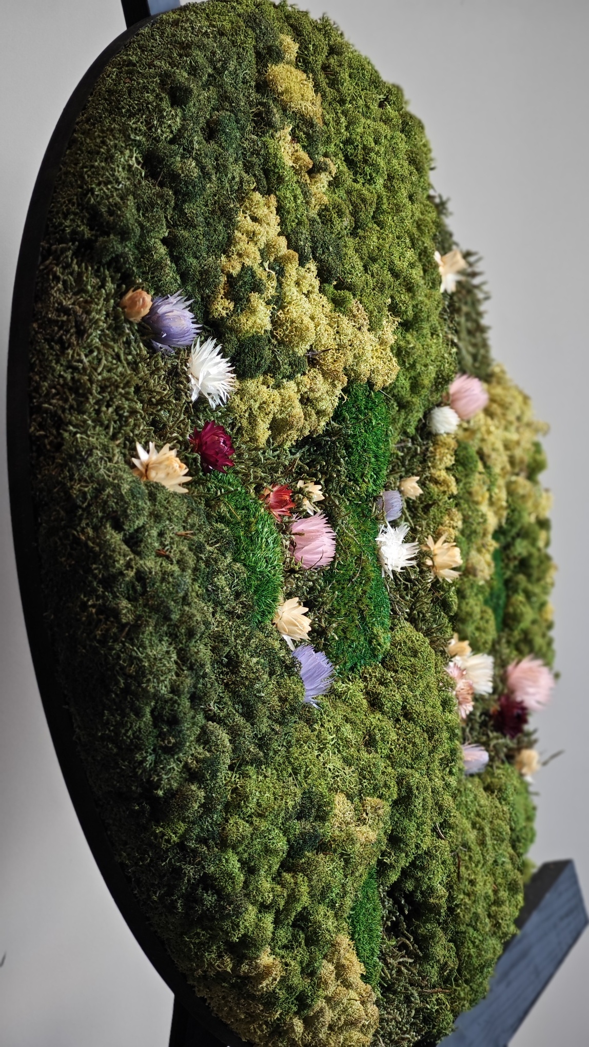 In der Moos-Variante Flora haben wir getrocknete Blumen mit Moos kombiniert. Beide sind ein Naturprodukt, das sich gegenseitig verstärkt. Die Blumen haben zarte rosa/violette und weiße Farbtöne. Dieses Moosbild erhellt das Interieur und hat einen frischen Look.