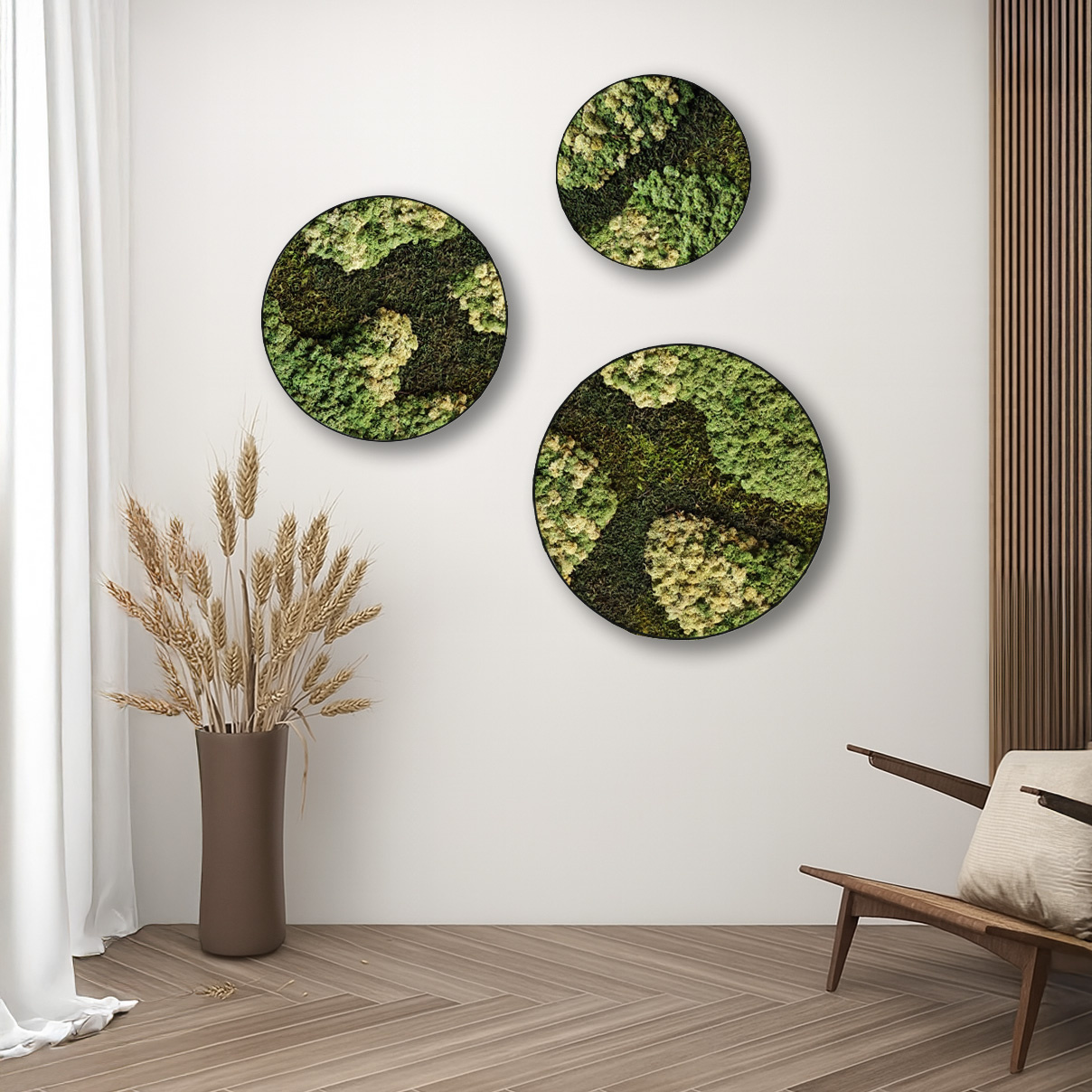 Mosvariante Vitalis erweckt Moos zum Leben in Form eines Pfades, der durch die Mitte des Kreises verläuft. Die weichen Moosstrukturen und natürlichen Farben sorgen für eine warme Ausstrahlung. Durch den Einsatz eines hellen Farbtons entsteht Ruhe und Ausgewogenheit. Das Design strahlt Schlichtheit und Tiefe aus. Ideal für alle, die natürliche Akzente mit Bedeutung schätzen.