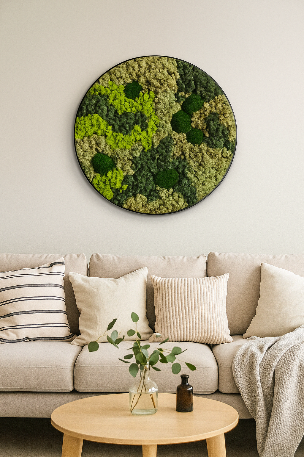 Auf dem Bild ist das Muster eines runden Moosbildes mit einem Durchmesser von 1,00 m zu sehen. Da es sich um ein Naturprodukt handelt, ist jedes Moosbild einzigartig. Daher kann das Design des gekauften runden Moosbildes von dem ausgewählten Bild abweichen. Möchten Sie eine andere Größe? Oder möchten Sie unser Montageteam in Anspruch nehmen? Kontaktieren Sie uns unter [email protected].