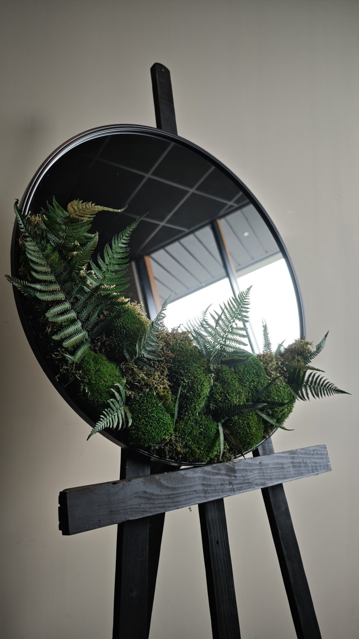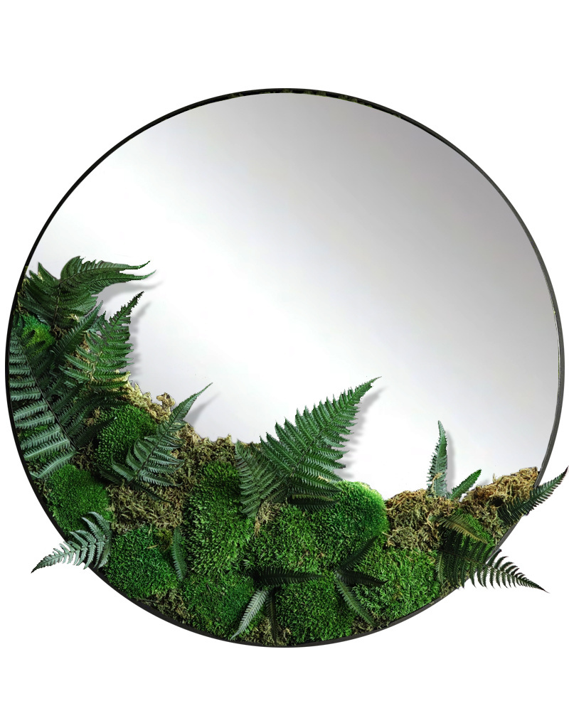 Dieser runde Dschungelspiegel enthält ein dezentes Detail aus Moos und Farnen. Die Kombination verleiht dem Spiegel eine luxuriöse Ausstrahlung mit einer frischen, nicht dominierenden Dschungelatmosphäre. Das Design bringt Ruhe und Tiefe in jeden Raum und passt perfekt in Flur, Wohnzimmer oder Schlafzimmer. Die natürlichen Materialien bleiben lange schön und sind vollständig pflegefrei.