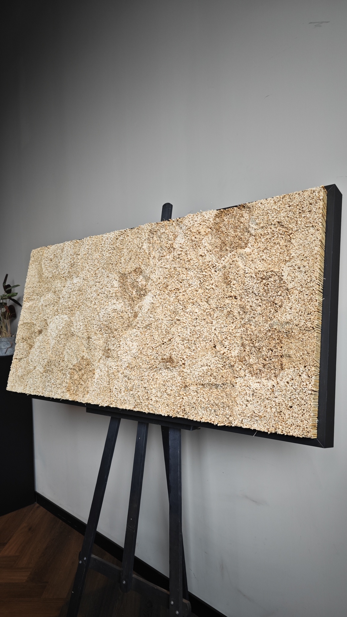 Ein 60 cm langes Schilfrechteck mit Holzrahmen wiegt +/- 8 kg. Die Struktur des Bildes besteht aus einer hölzernen Grundplatte, die von einem Holzrahmen in Weiß oder Schwarz umgeben ist. Das Schilfrohr ist an der Holzplatte befestigt und ragt etwas über den Rahmen hinaus, so dass die Gesamtdicke des Bildes 5-7 cm beträgt.