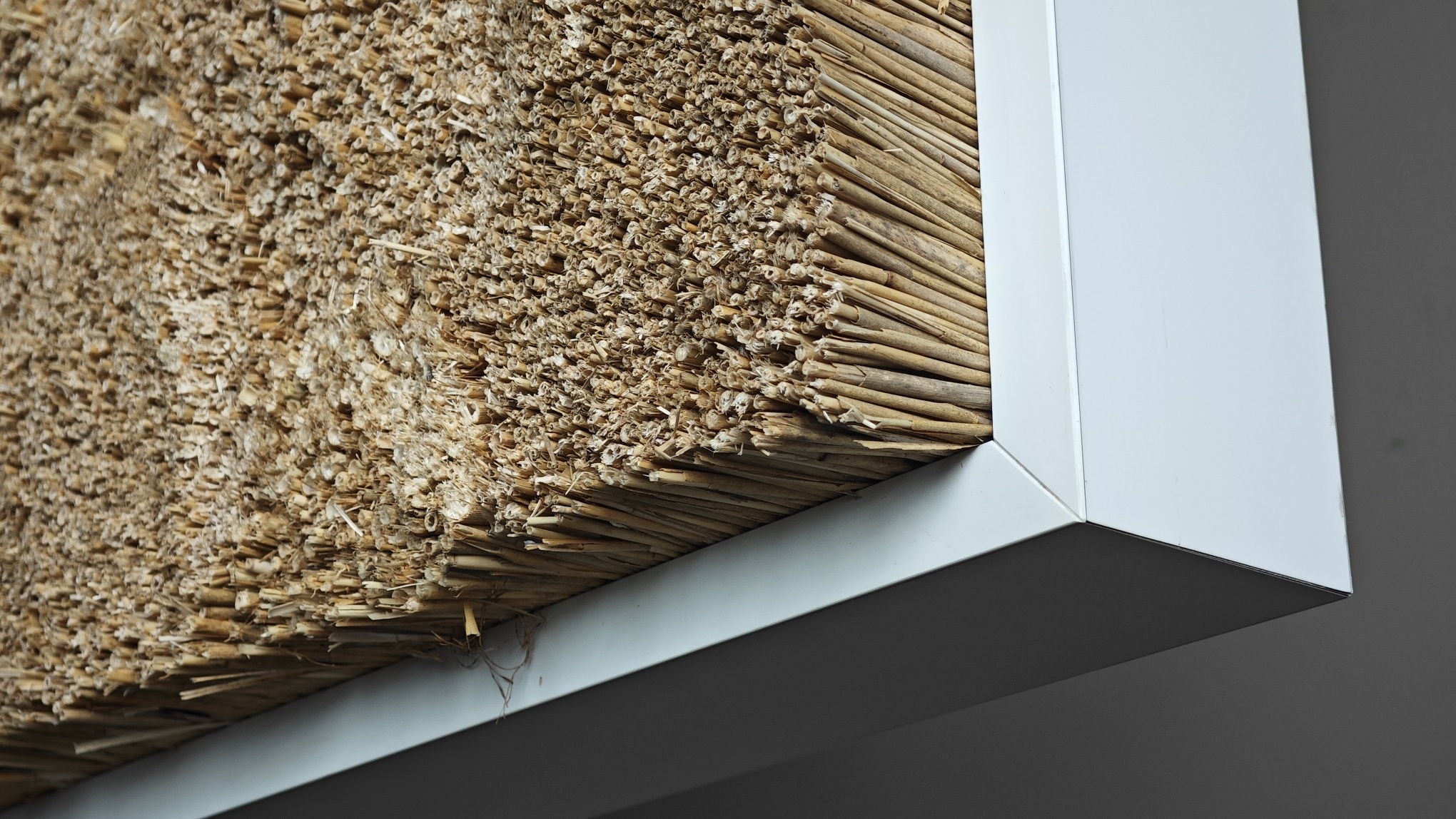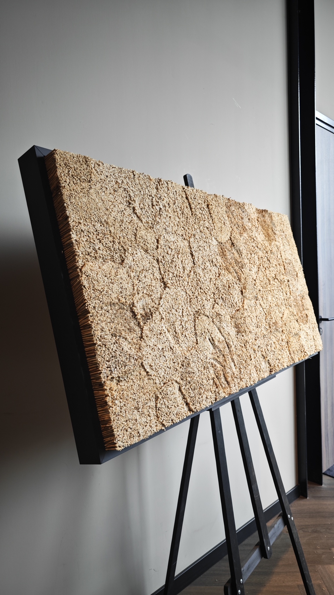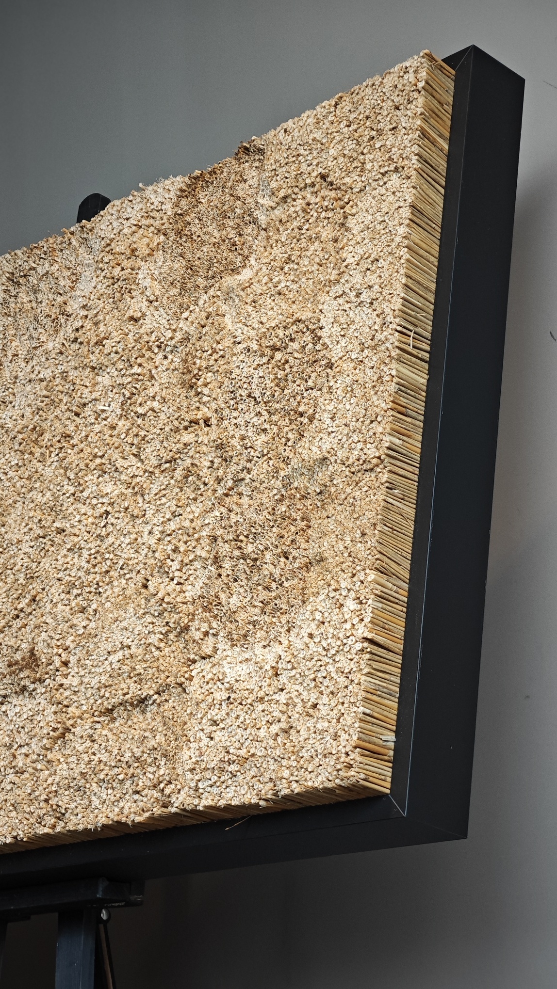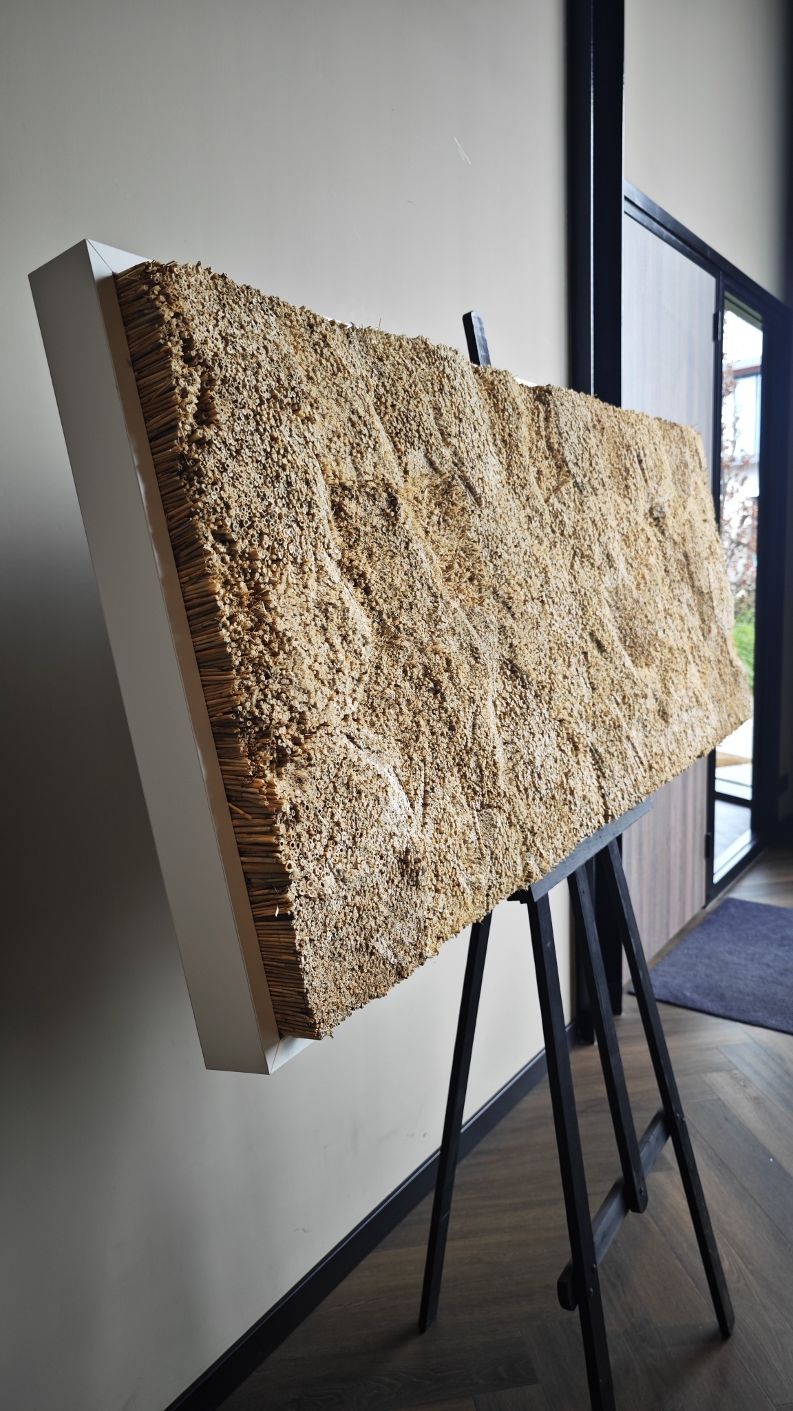 Ein 60 cm langes Schilfrechteck mit Holzrahmen wiegt +/- 8 kg. Die Struktur des Bildes besteht aus einer hölzernen Grundplatte, die von einem Holzrahmen in Weiß oder Schwarz umgeben ist. Das Schilfrohr ist an der Holzplatte befestigt und ragt etwas über den Rahmen hinaus, so dass die Gesamtdicke des Bildes 5-7 cm beträgt.